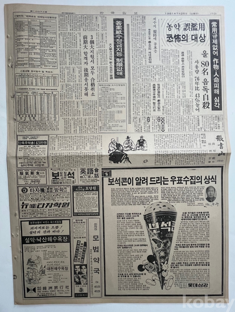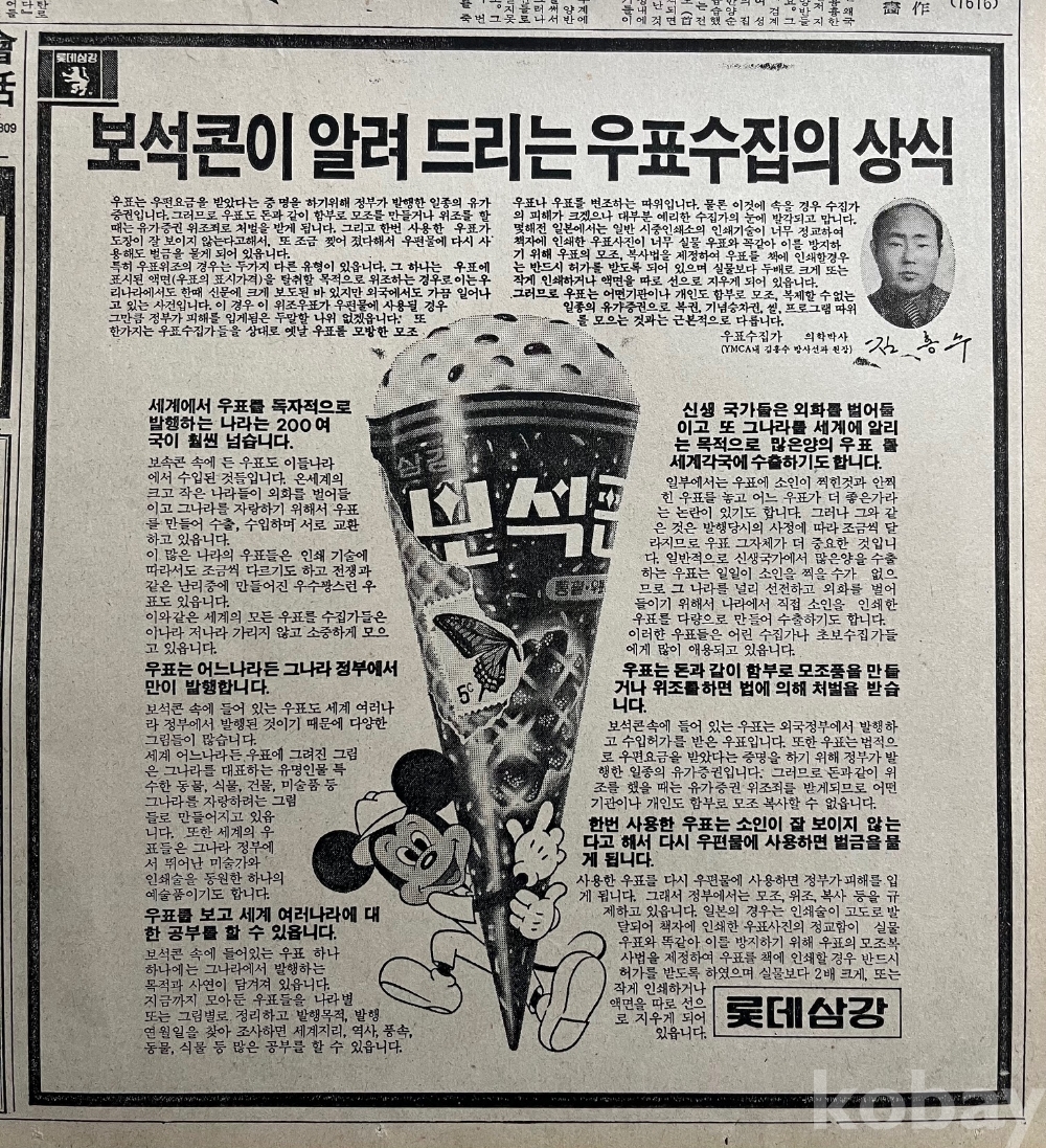 우표가 들어있는 롯데삼강 보석콘 광고가 실린 한국일보 낱장입니다.