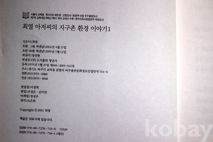 최열 아저씨의 지구촌 환경이야기 - 최열 著. 노희성 그림 / 2009년. 도서출판 청년사 발행