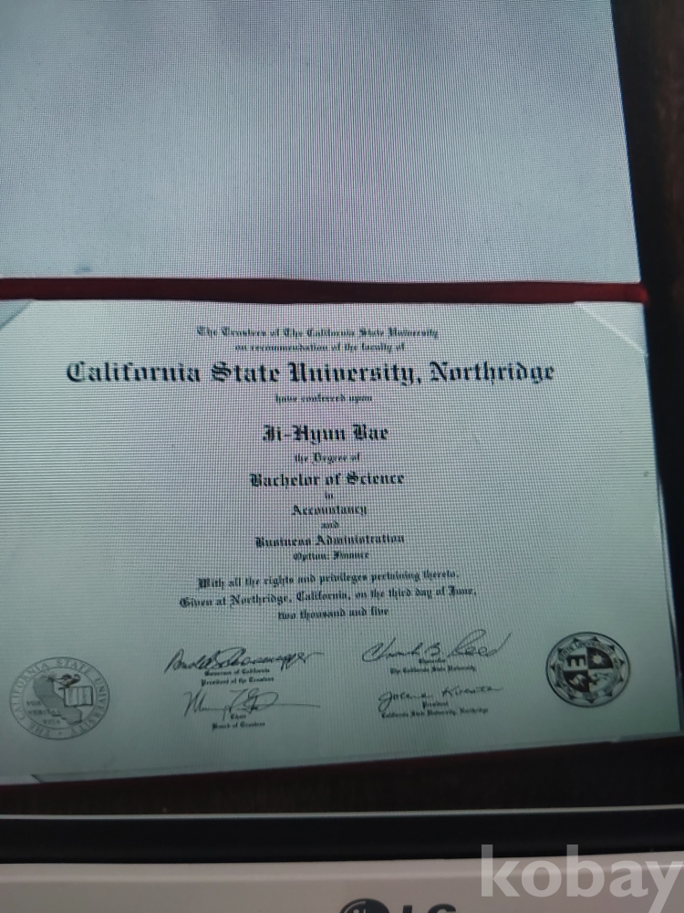 미국 켈리포니아 주립 대학교 한국인 유학생 학위증서 입니다.