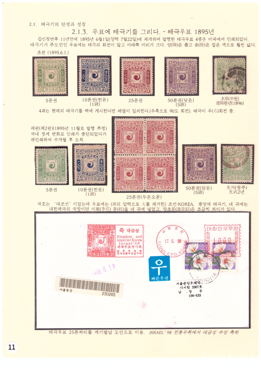 ③ 태극우표 25푼권 재판(再版) 미사용 1장 추가 포함.