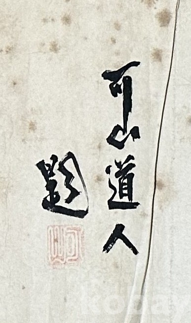 좌측에는 “可山道人(가산도인)”으로 추정되는 서명과 인장이 있으며, 우측에도 낙관이 찍혀 있습니다. 세월감은 있으나 전체적인 보존 상태는 양호하여 고풍스러운 멋을 그대로 간직하고 있습니다. 전통 한자 서예의 기운을 공간에 더하고자 하는 수장가에게 추천할 만한 작품입니다.