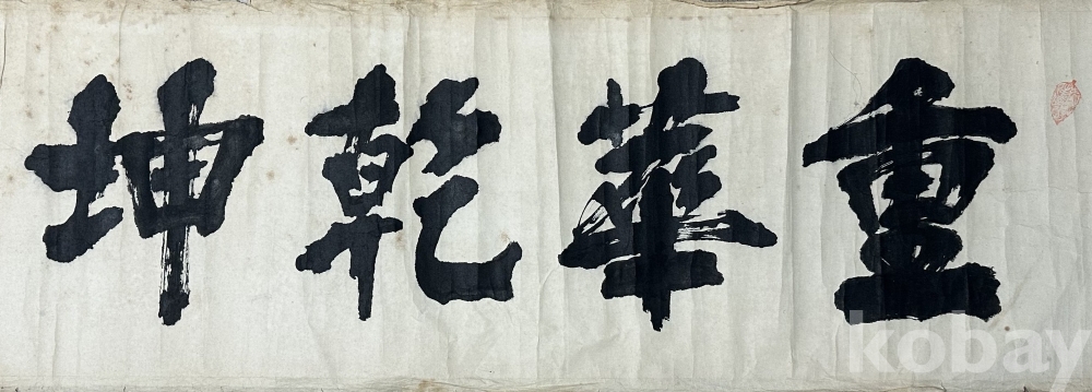 힘 있고 웅장한 필치로 「坤乾華重(곤건화중)」이라 쓰여진 전통 서예 작품입니다. ‘하늘(乾)과 땅(坤)의 기운이 꽃처럼 피어나고 겹겹이 더해진다’는 의미로, 길상과 번영을 상징하는 문구입니다.
