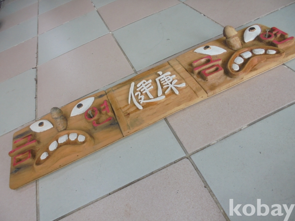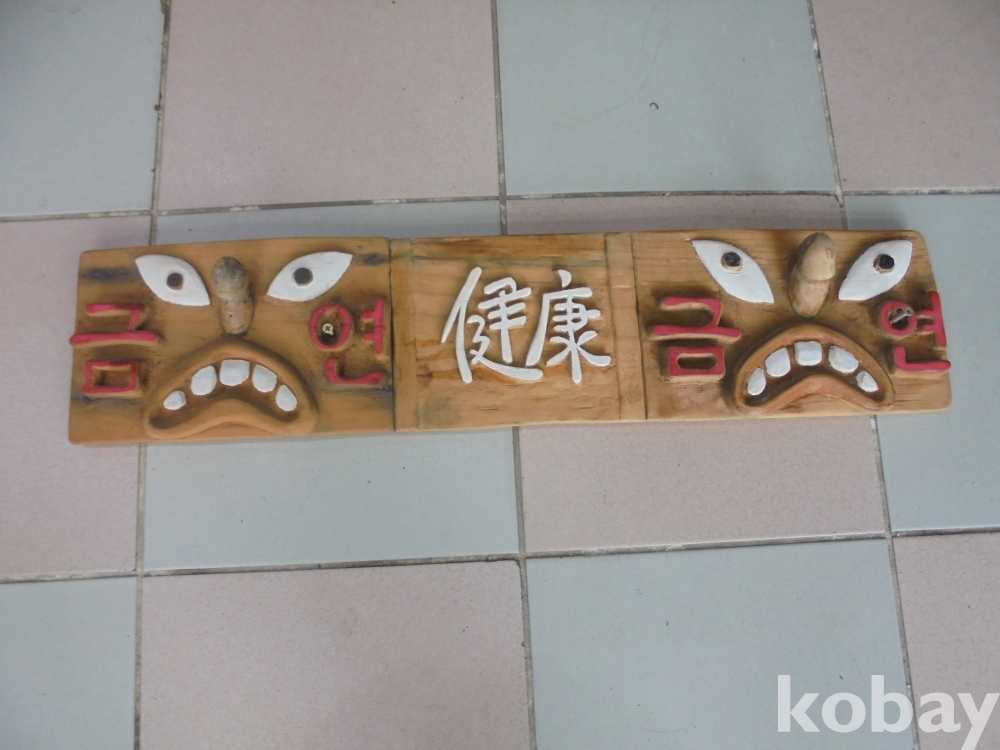 통판에 금연과얼굴을 붙인것이아니고 조각하여 파낸것이고 건강글씨도 조각한 3개로 판을 붙인 뜻깊은 금연건강 조각한 예술적인 현판