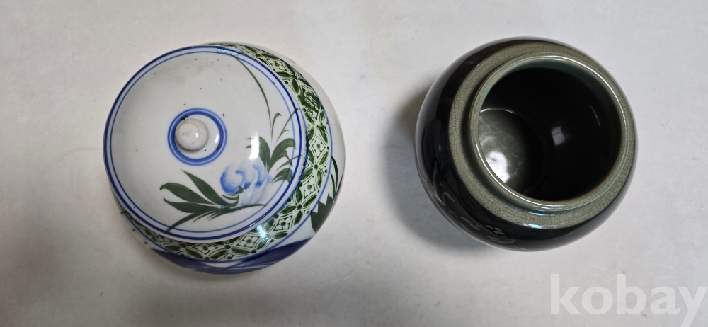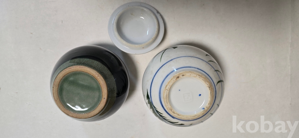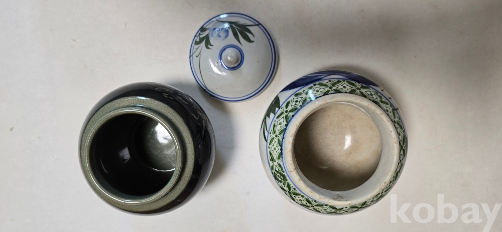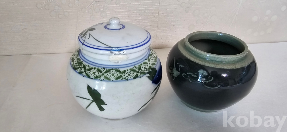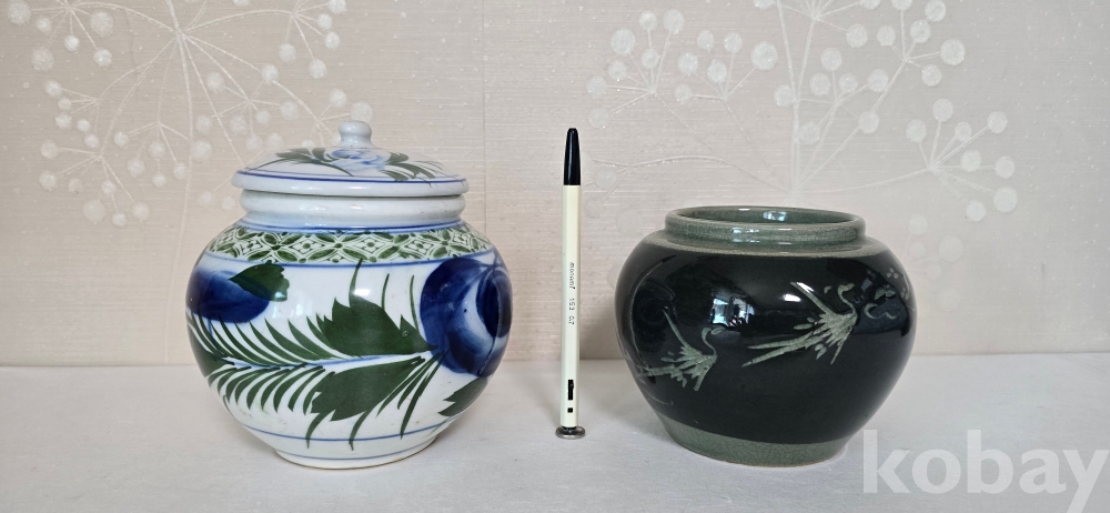 @. 연대가 오래된 묵직한 골동급 목단항아리 와 운학문 항아리 2점.