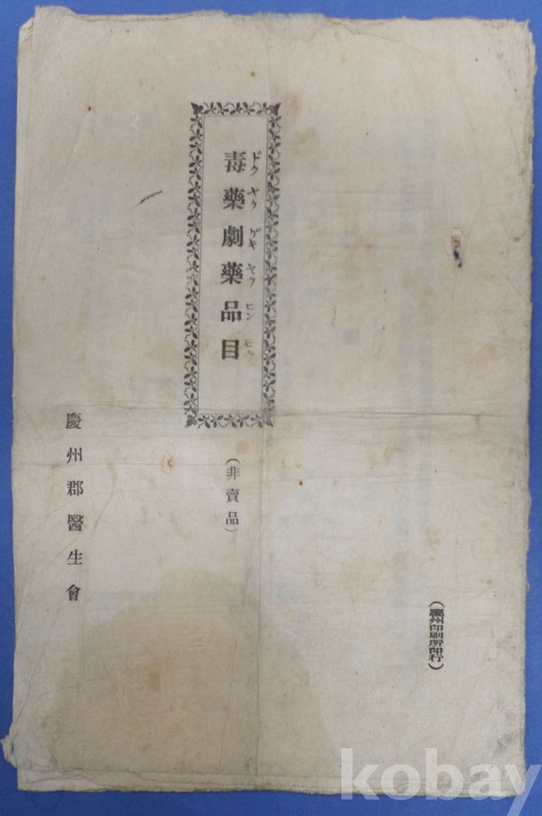 **** 慶州郡醫生會에서 발행한 [毒藥劇藥品目] 1912년 3월 조선총독부령제66호로 지정한 독약,극약,극성약품 내용이 실려있다