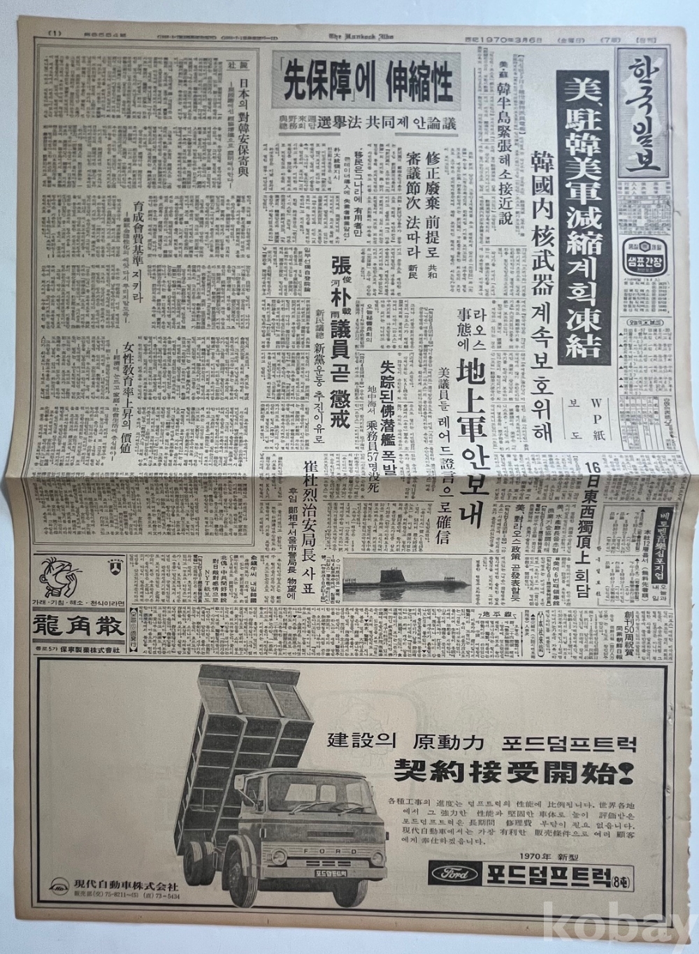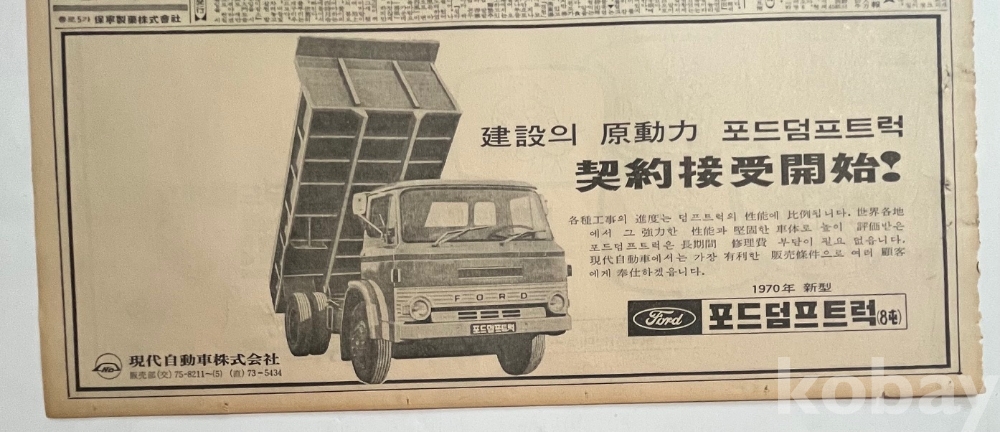현대자동차 덤프트럭 광고가 실린 한국일보 낱장입니다.