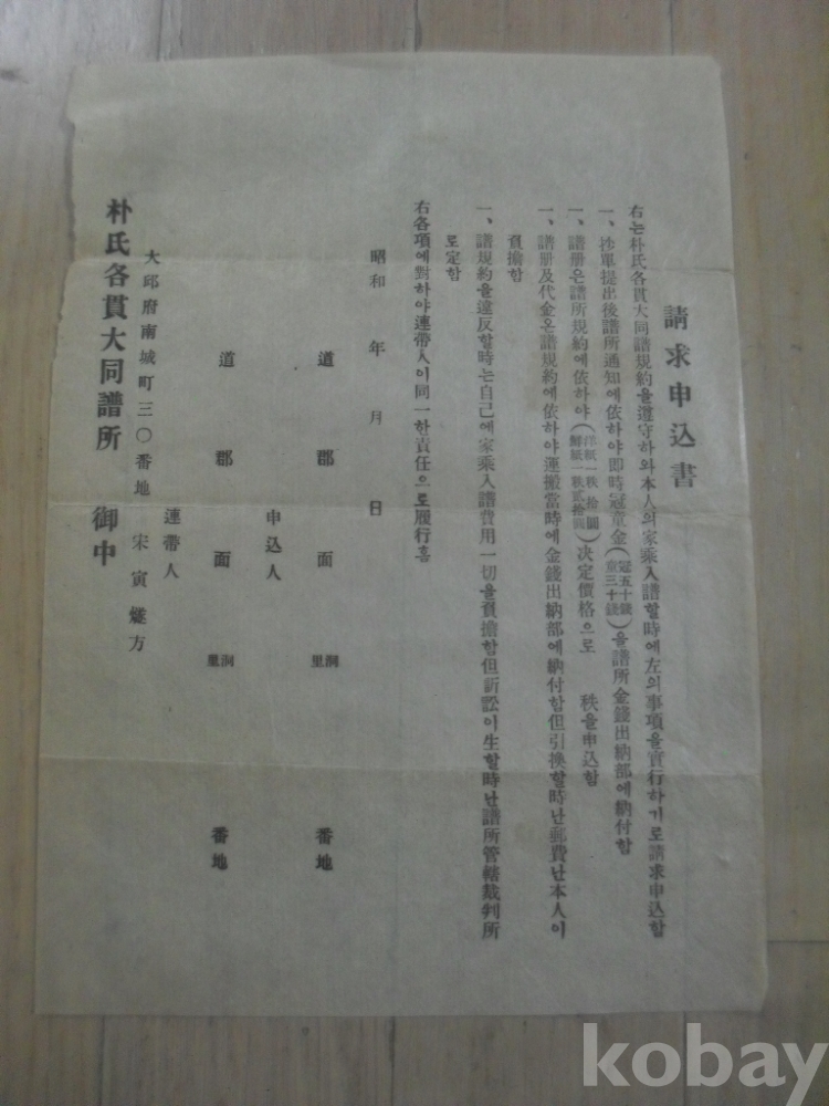 1229h)일제강점기 대구 南城町 朴氏各貫大同譜所의 족보 수단 請求申込書