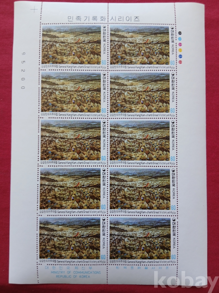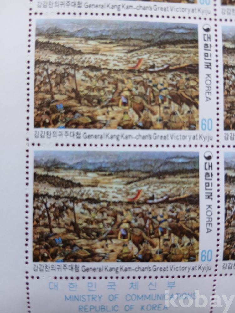 우표: 민속 기록화 시리즈 귀주대첩 기념 우표 전지 (1982년 액면가 600원)------미사용으로 상태 아주 양호 합니다