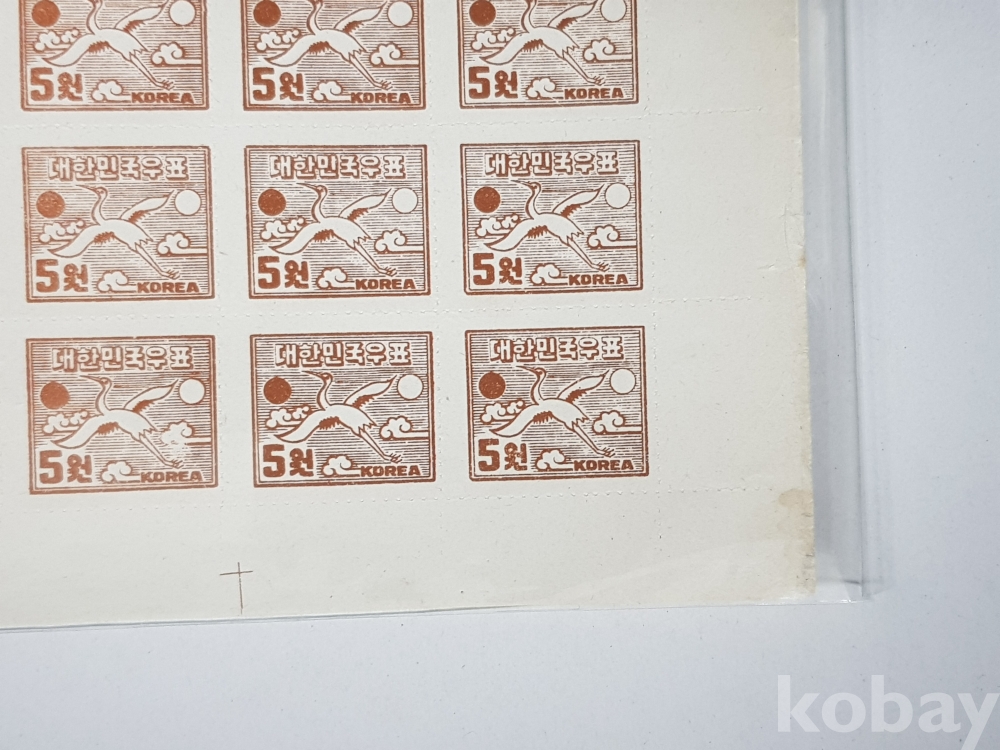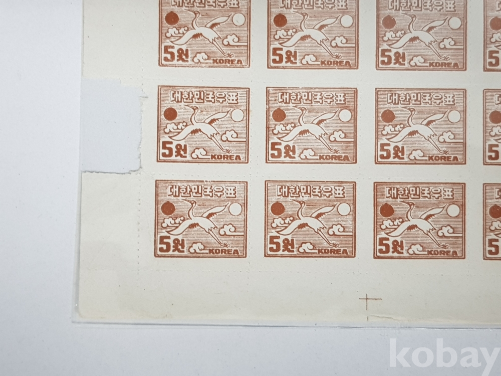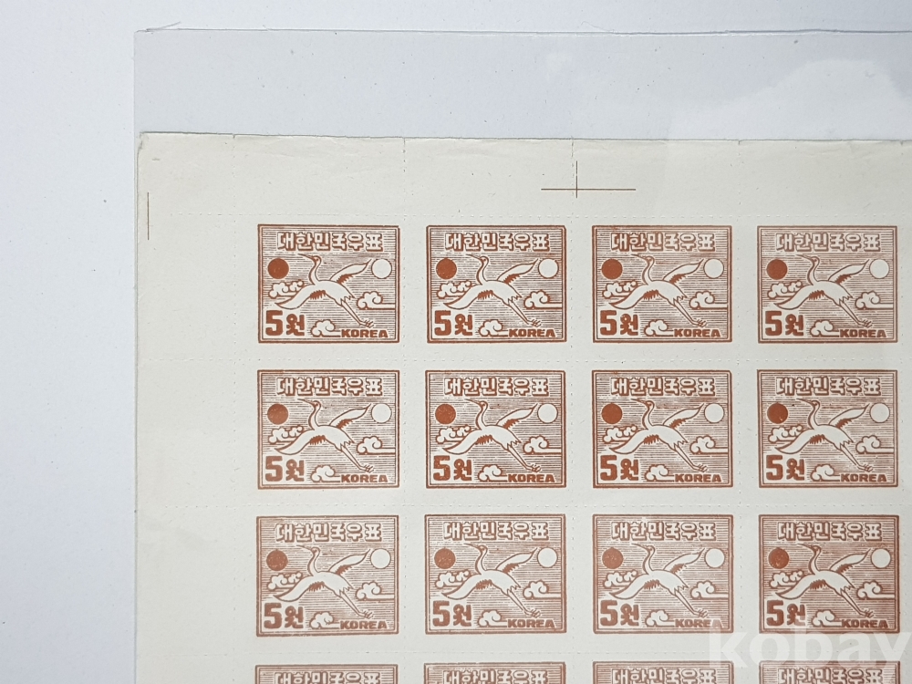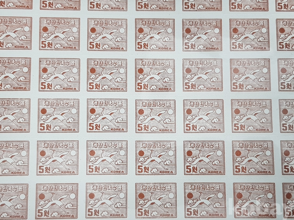 - 미사용 1951년 제 2차 원화 보통우표 동양정판사 5원 학 보통우표 전지