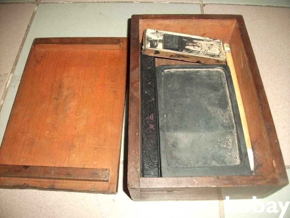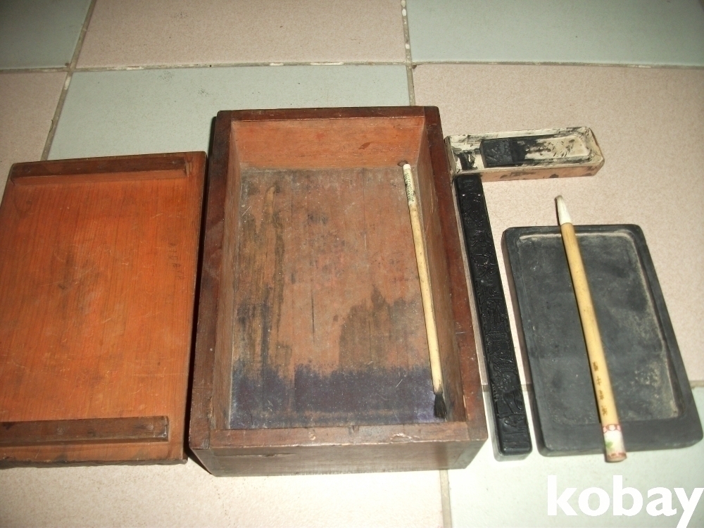 질좋은 나무로 짜서 작은벼루와 붓2점 먹1점 문진1점 질이잘들은 벼루집일체 가로세로높이 24 x 16 x 8 cm 사진참조