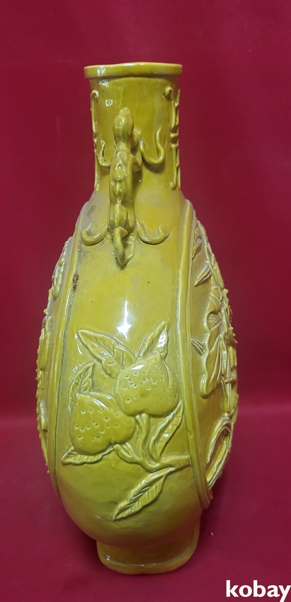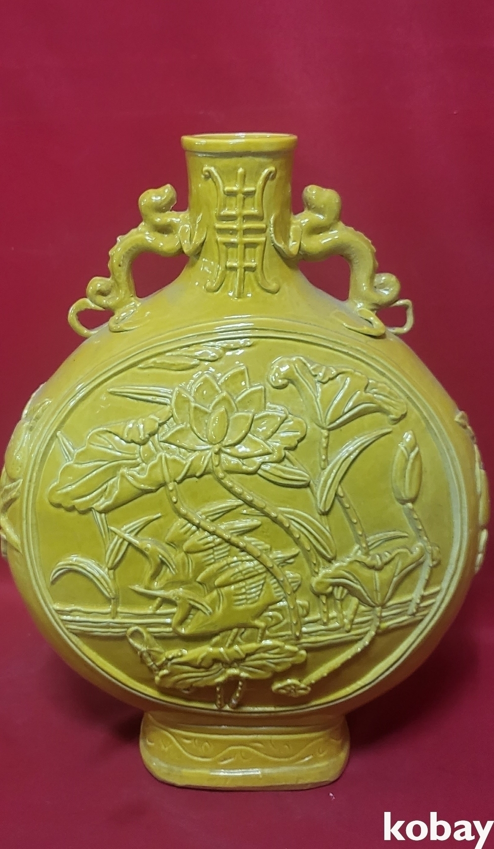 왕병영 관지 보이는 황유 연꽃과 물총새 문 양이 편병입니다,