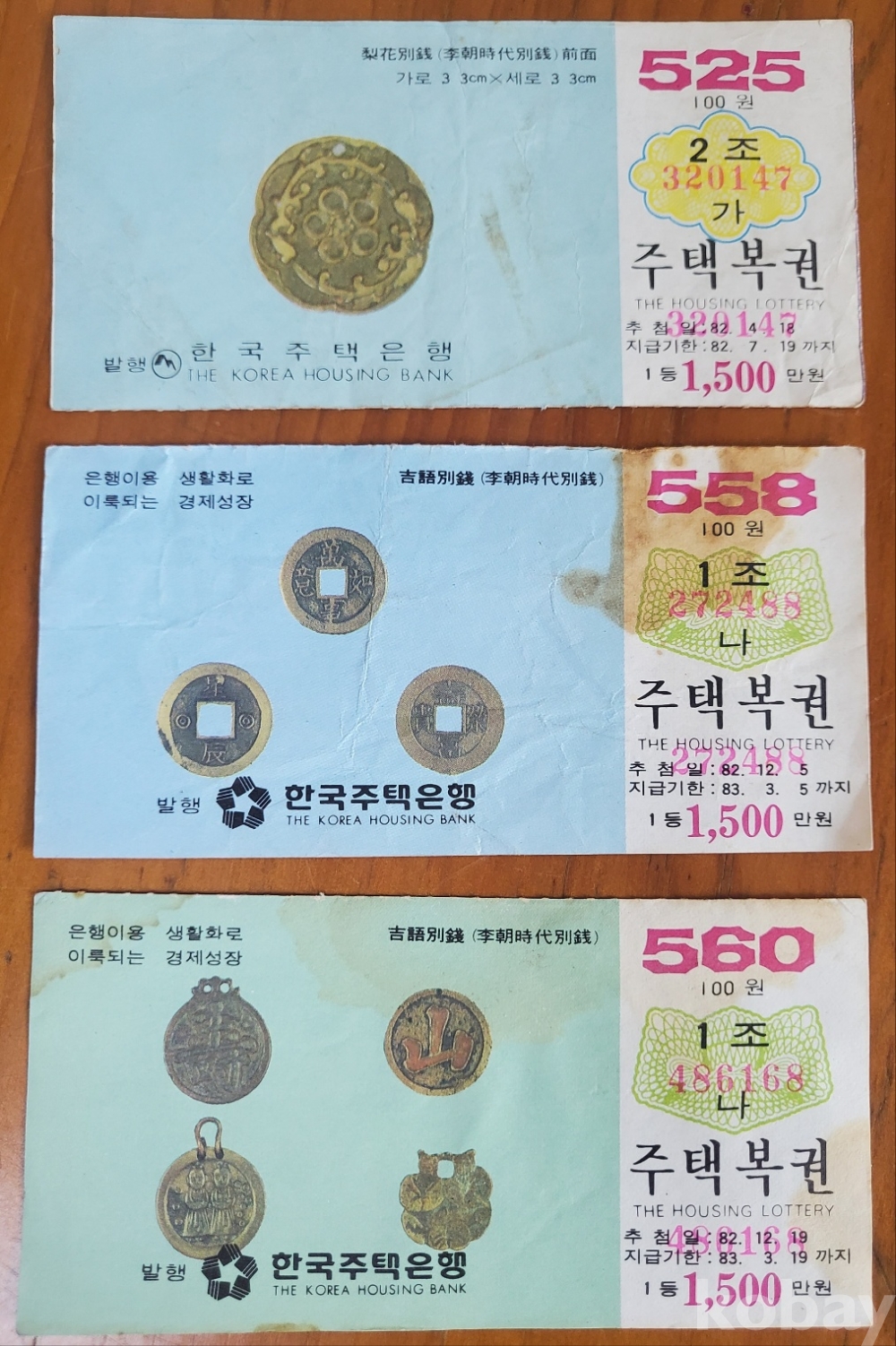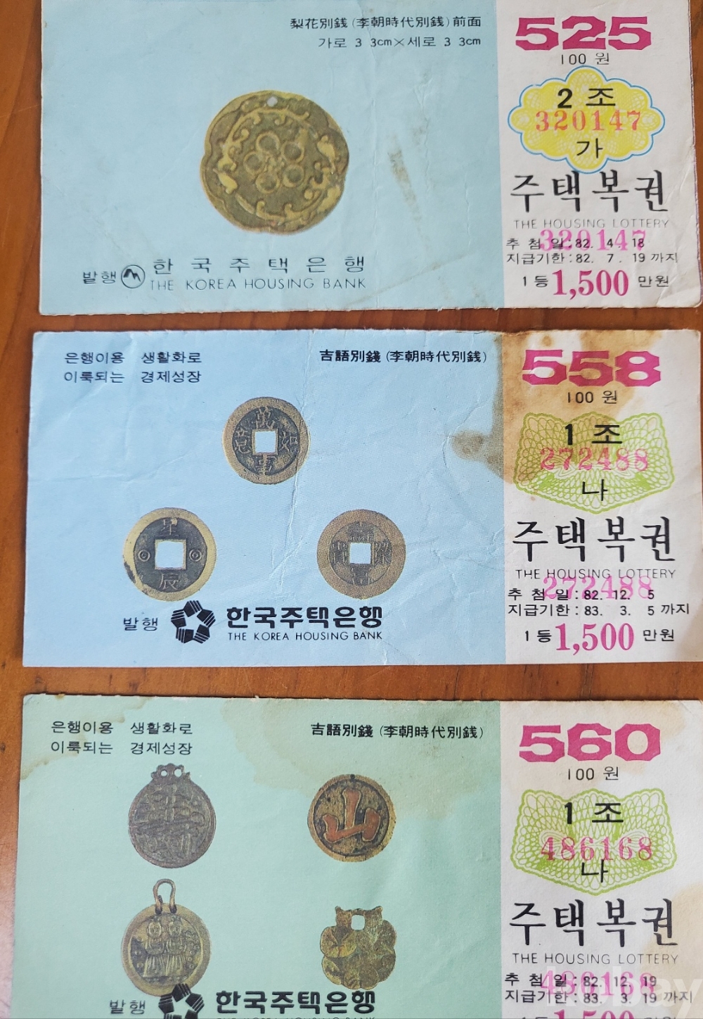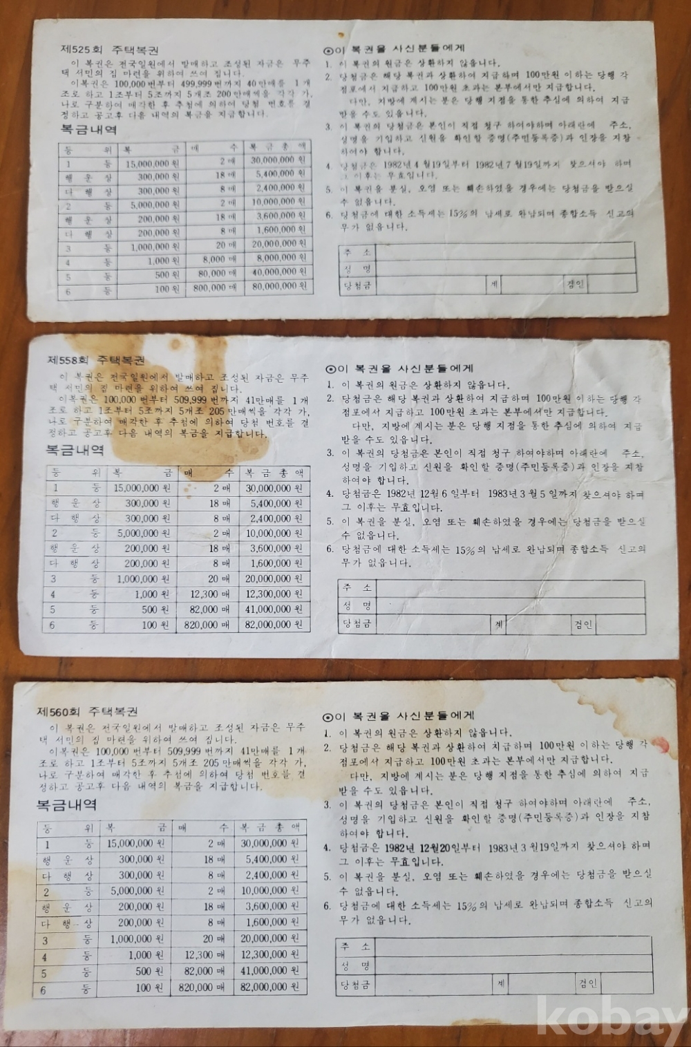 1. 주택복권 3장(525, 558, 560회), 한국주택은행, 1982년, 상태 중, 사진 참조
