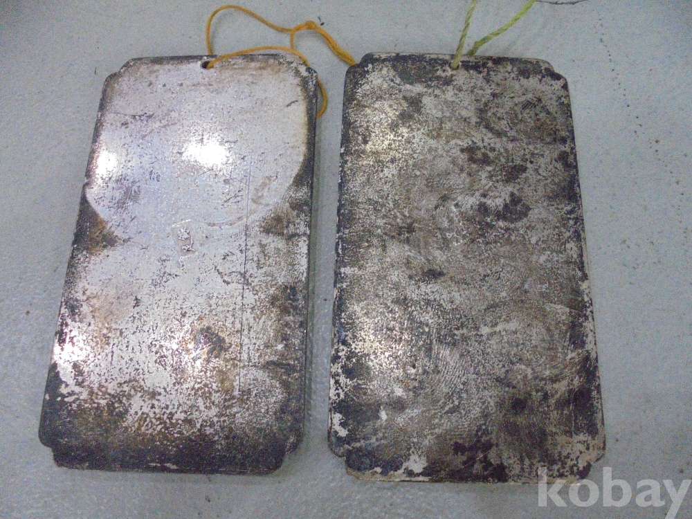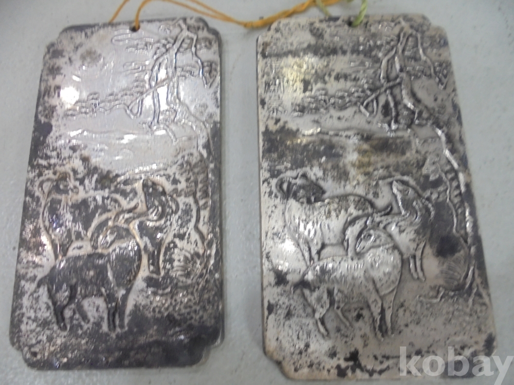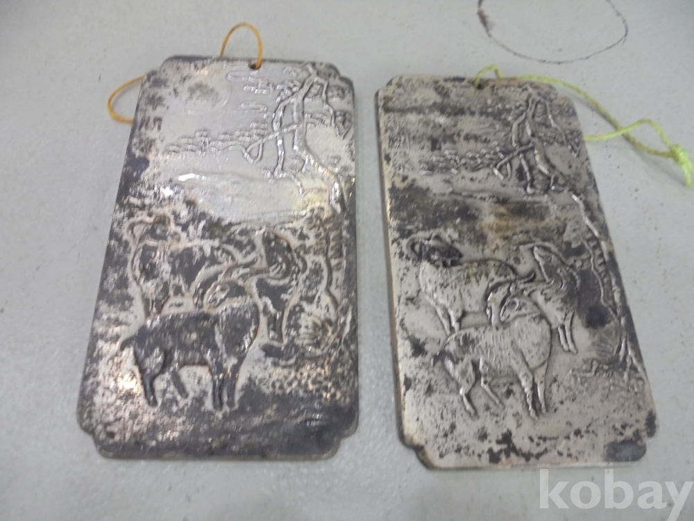 뒷면에 銀足이라는 글씨와 앞면 노송나무와 사슴이 양각되여 거는구멍이있어 기념품인지 연구자료가되는 노송과 사슴 무거운 은족판 2점