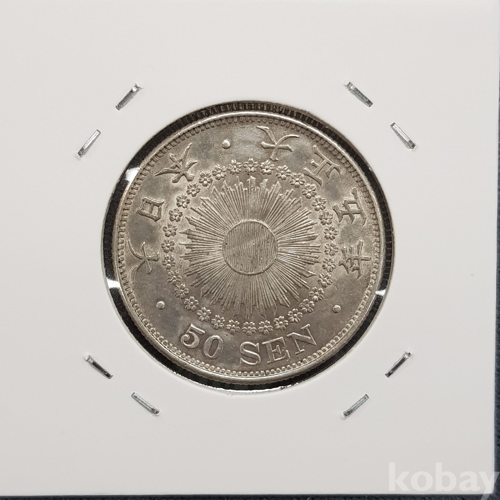 - 진품 일본 은화 - 대정 5년(1916년) 오십전 욱일 은화 UNC 미사용