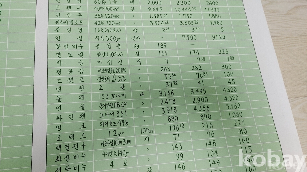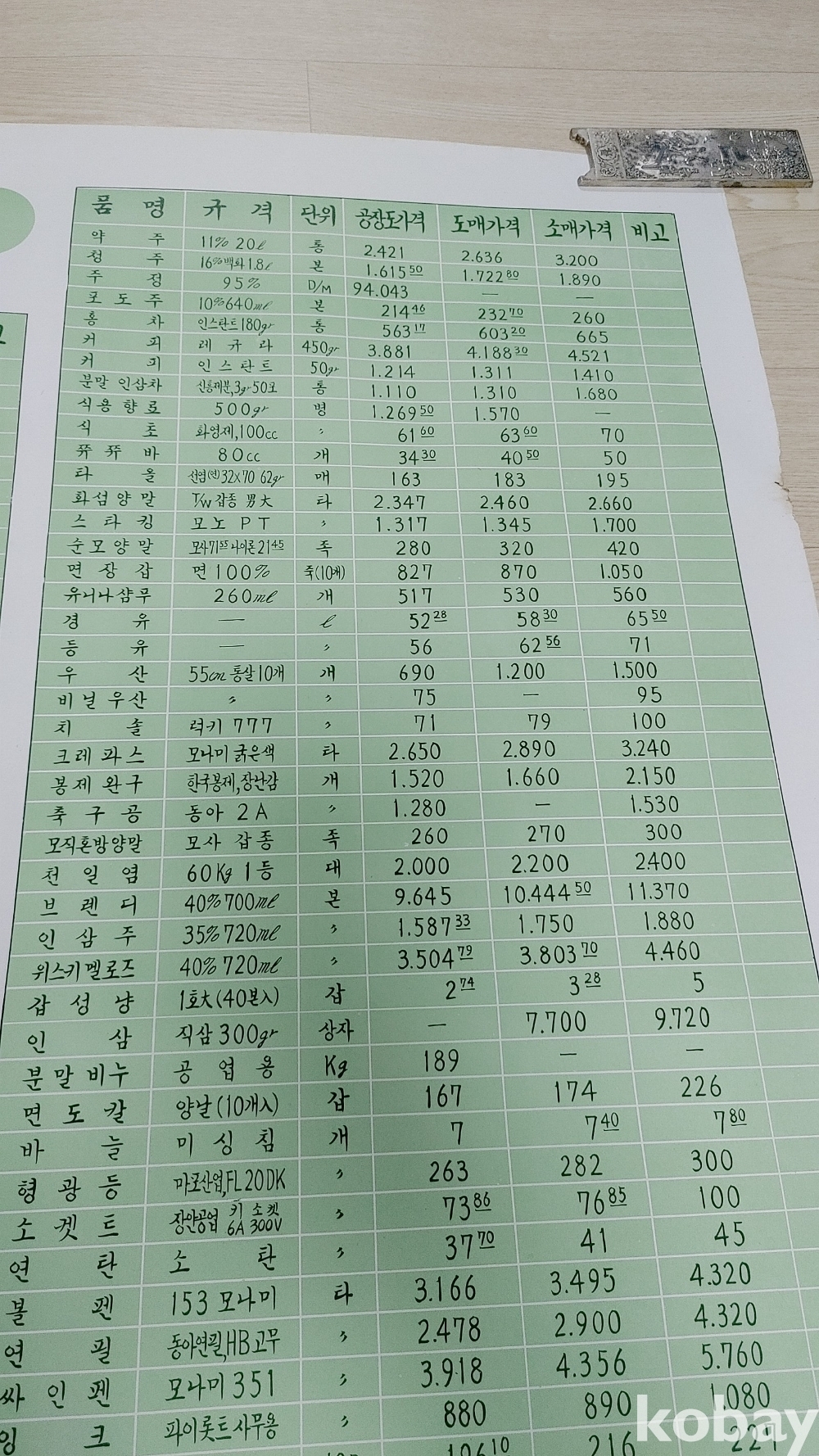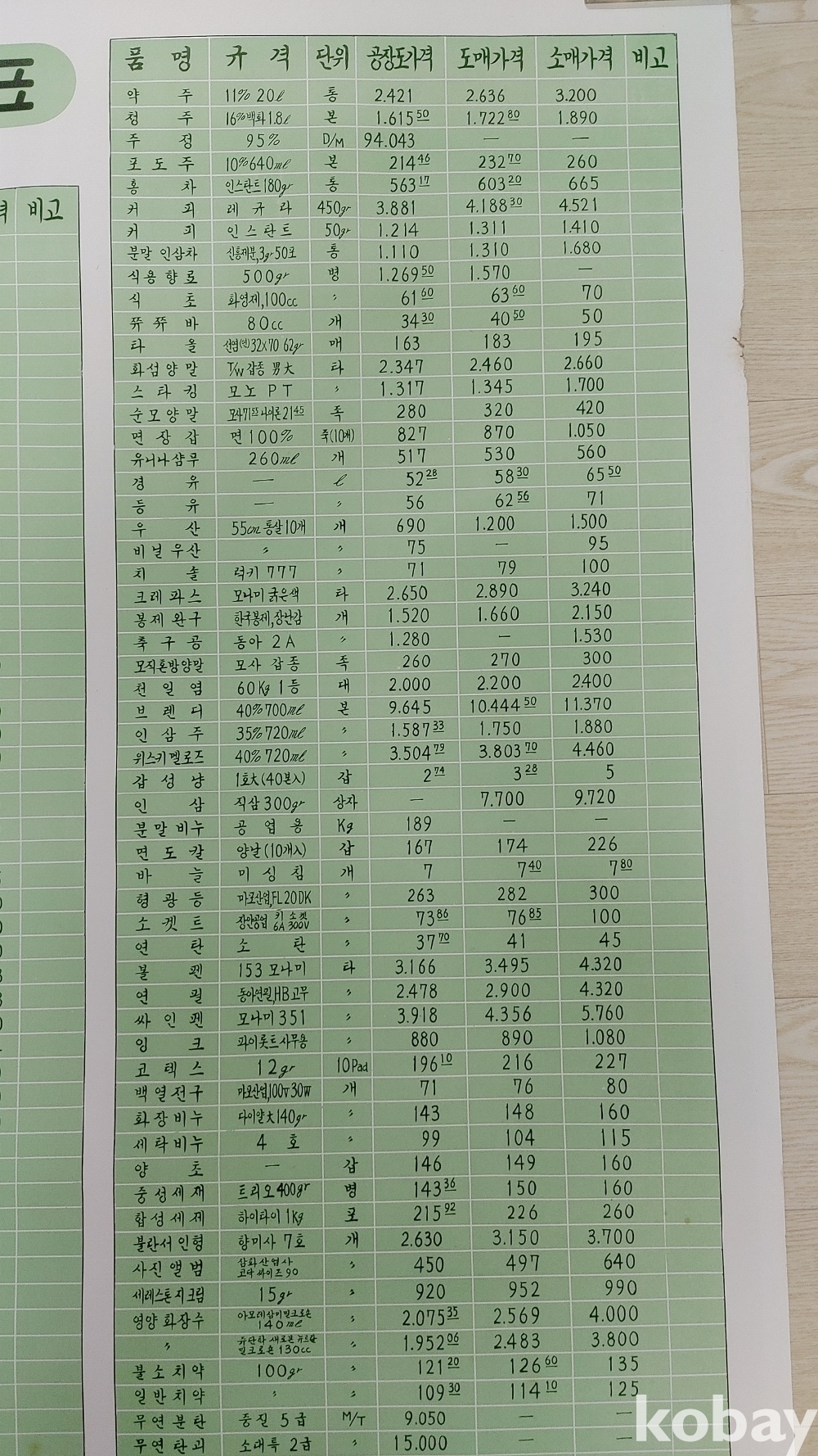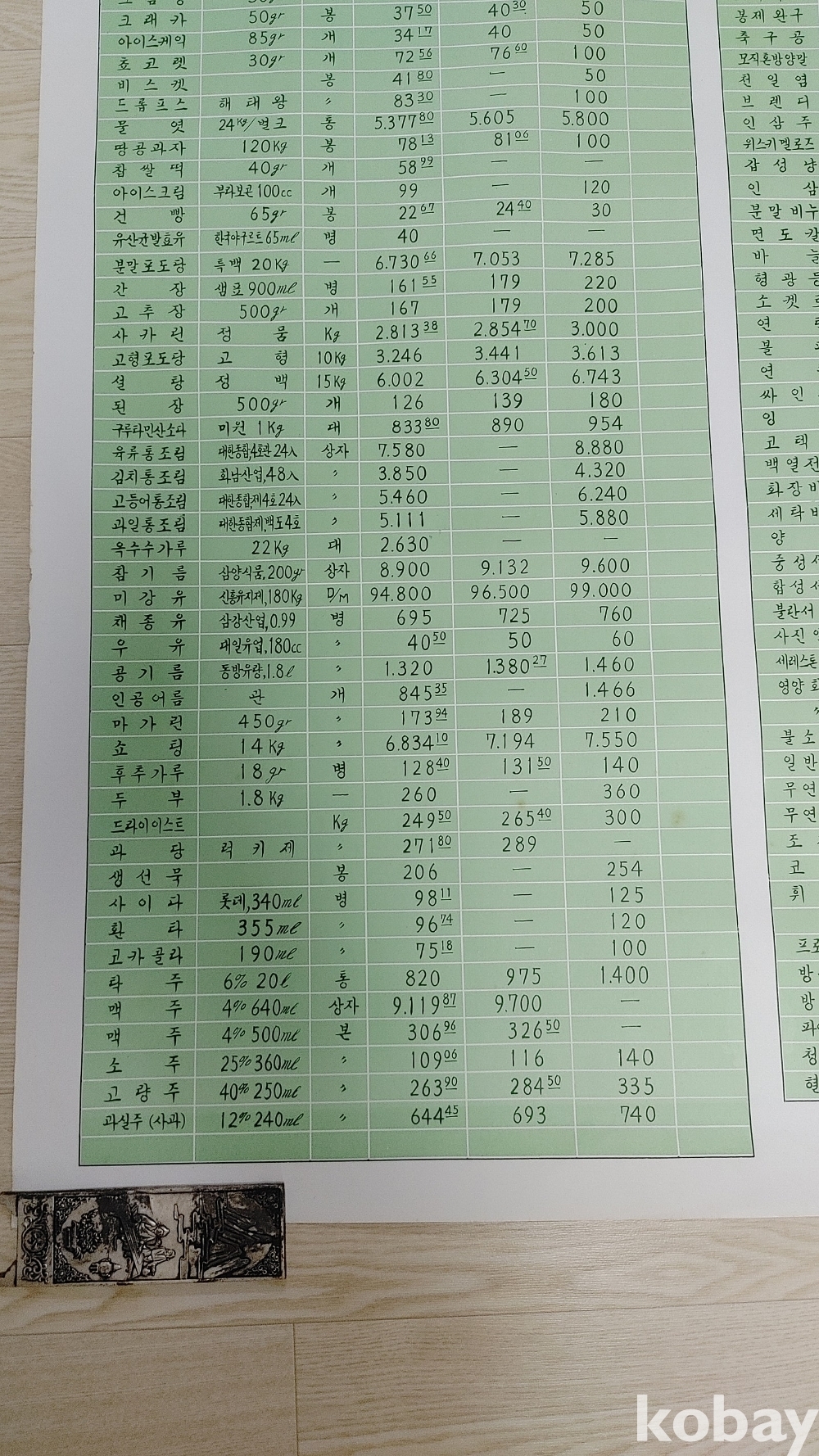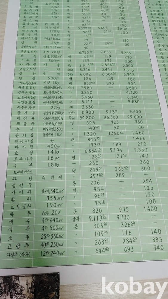 과자 껌 빵 우우 분유 음료 치약 술 콜라 스타킹 화장품 연탄등등 가격표 입니다 왠만한 생활용품들은 다 적혀 있습니다