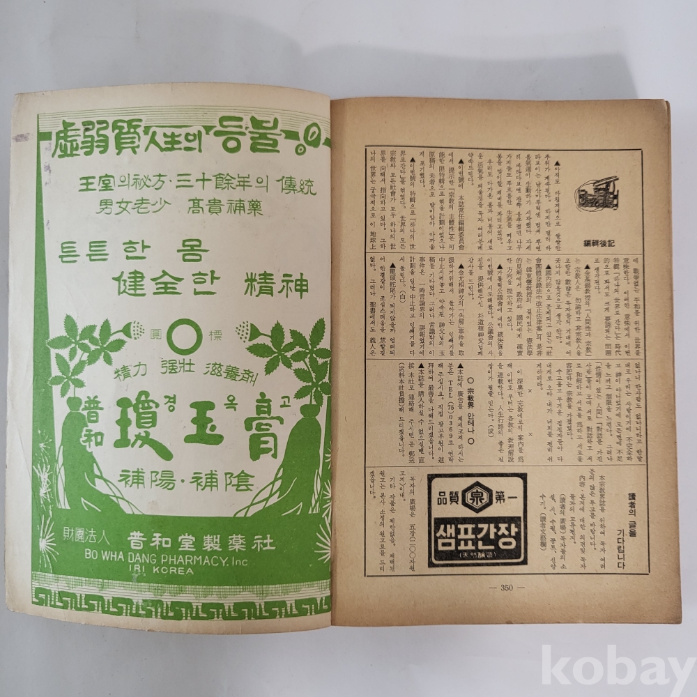 김동리 조병화 김 웅 박태준 등의 문장 / 바티칸 공의회 교황 바오르 6세 / 제일생명보험 광고(뒤표지)