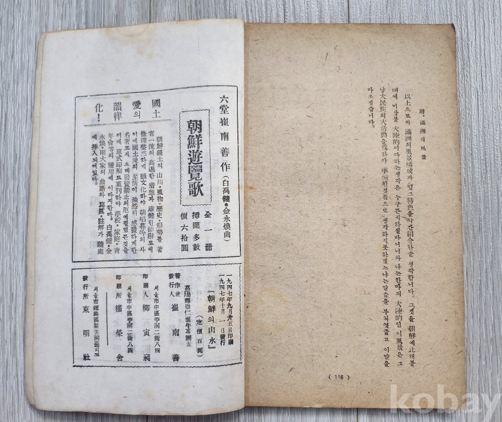 1947년 육당 최남선의 조선의산수 입니다 116페이지 낙질 파본없이 책등까지 상태 양호합니다