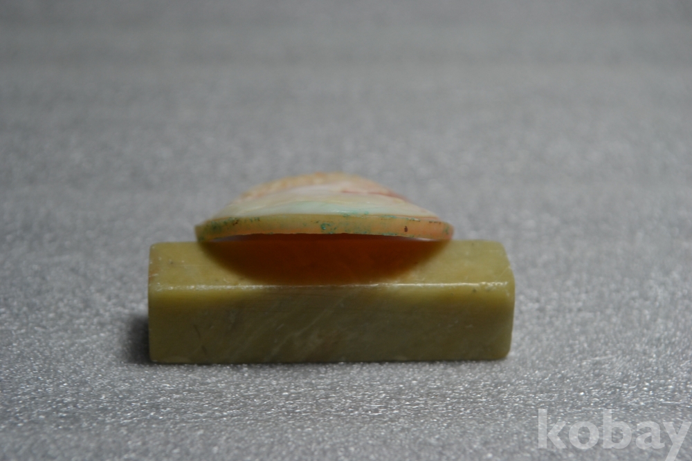 ** 까메오 작품의 측면부 테두리 부분(3시방향)을 보시면 작은 튐상처가 1곳 있습니다. (검은핀으로 가르킨 부분 4번째, 5번째 사진참조)