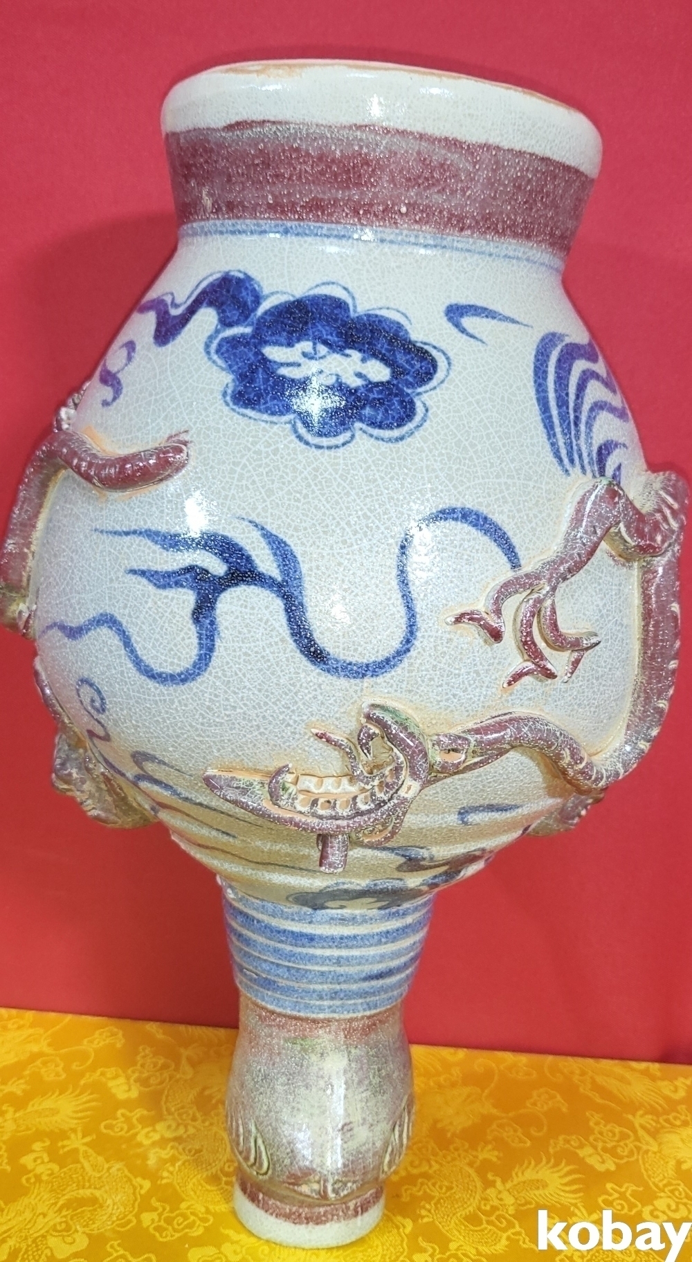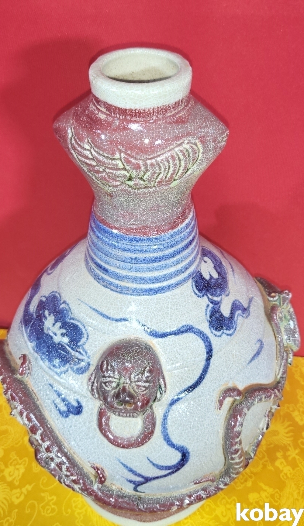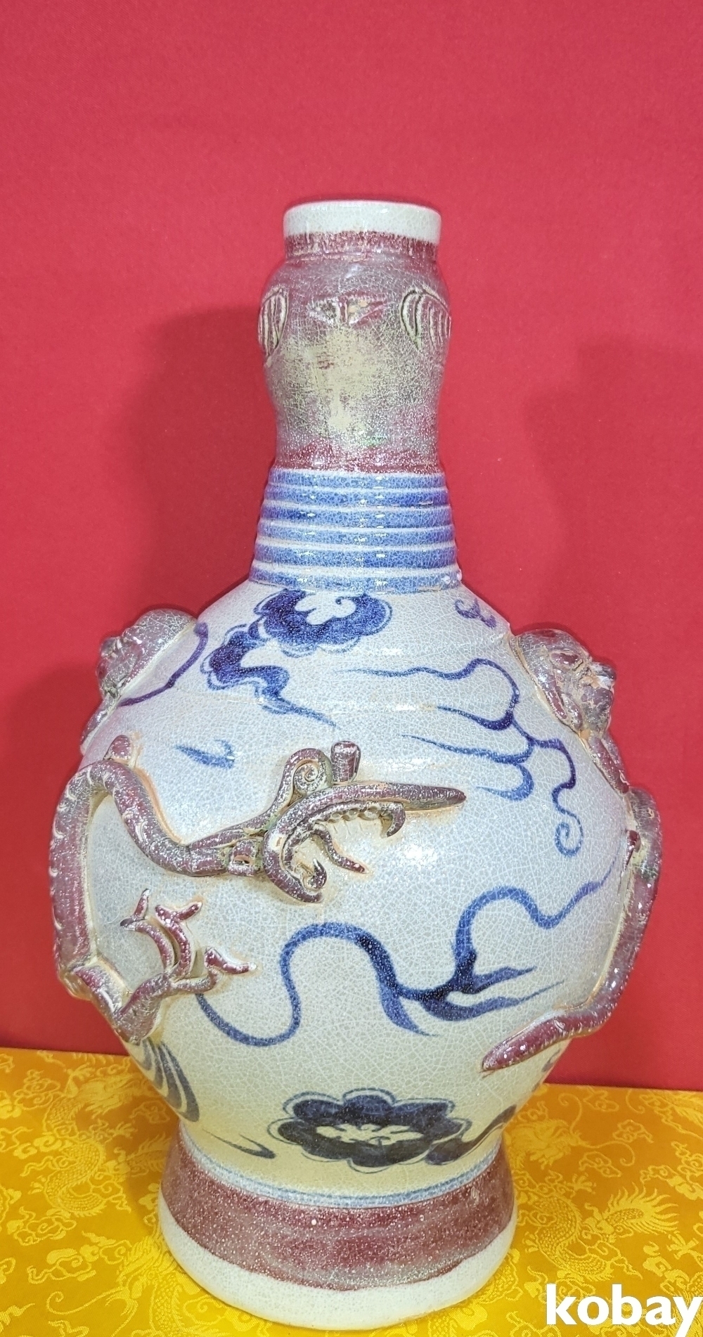 연대 짱짱한 유리홍 첩화 (貼花) 용문양 양이(兩耳) 병입니다,