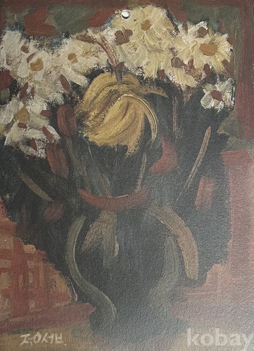 짙은 색조 속에 노란 국화꽃과 흰 꽃들이 어우러진 작품으로, 작가 특유의 감정 표현과 붓 터치가 돋보입니다.