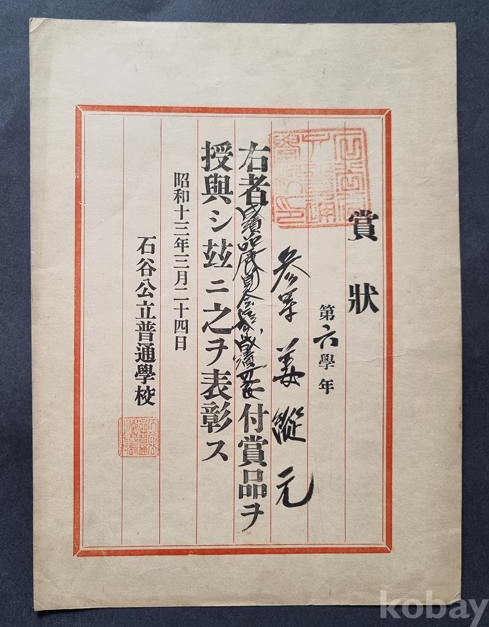 M-37 / (희귀자료) 일제강점기 "상장" (경상북도 고령군 우곡면)