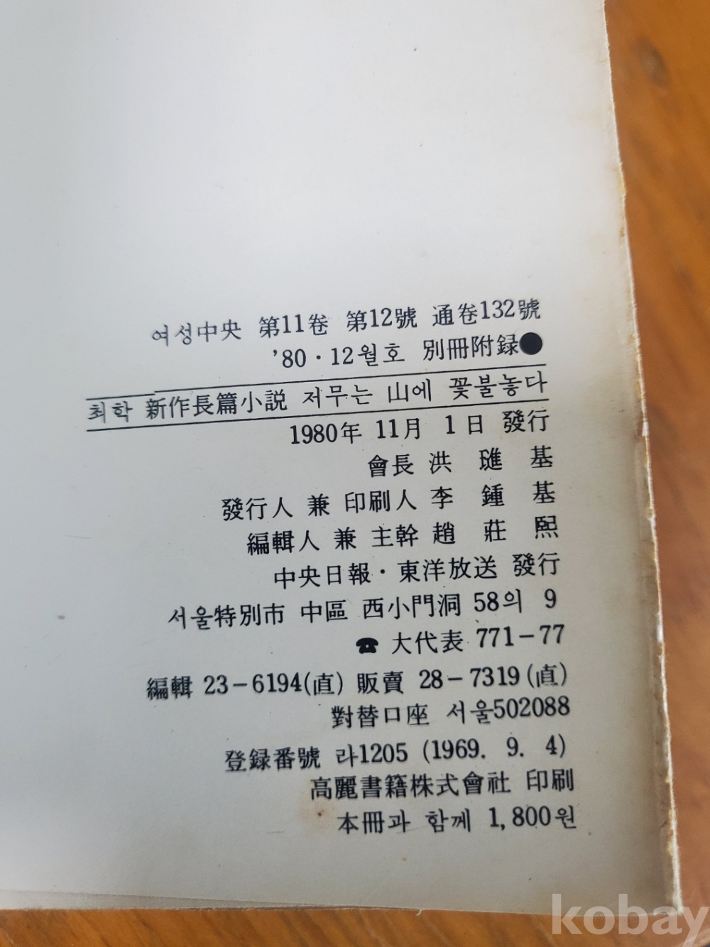 1. 저무는 산에 꽃불 놓다, 최학, 발행 중앙일보 동양방송, 1980년, 273쪽, 상태 상, 사진 참조
