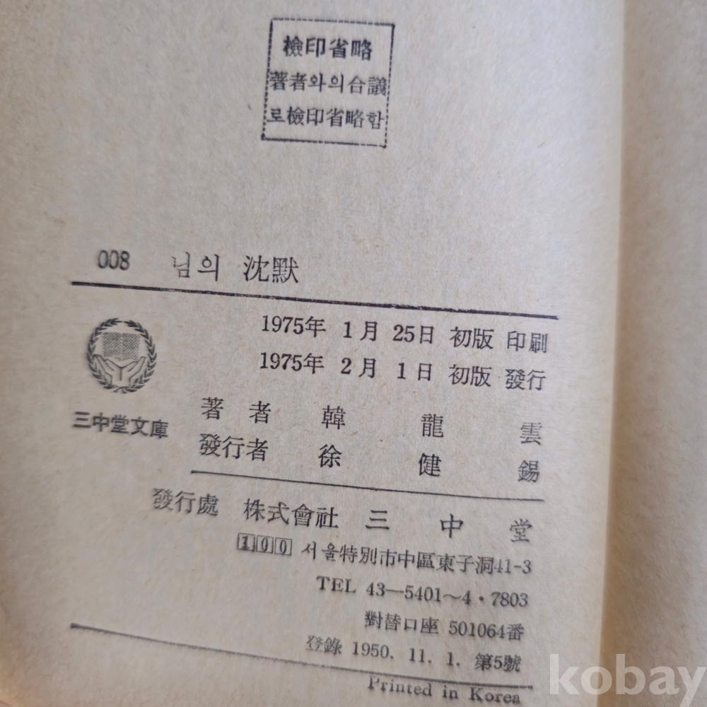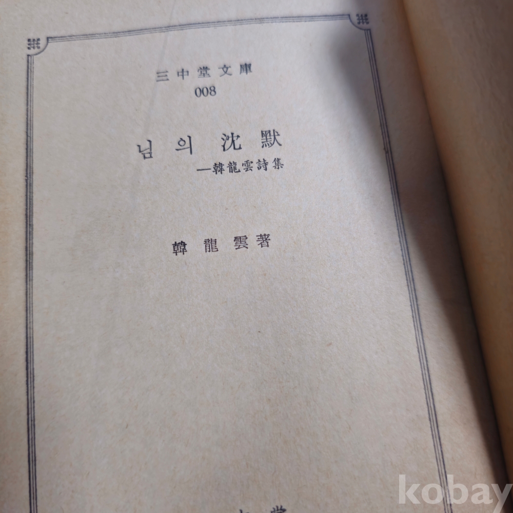 (((천원경매))) (((오래된책/서적))) 三中堂文庫 - 님의 沈默 - 韓龍雲 著(1975년 초판)