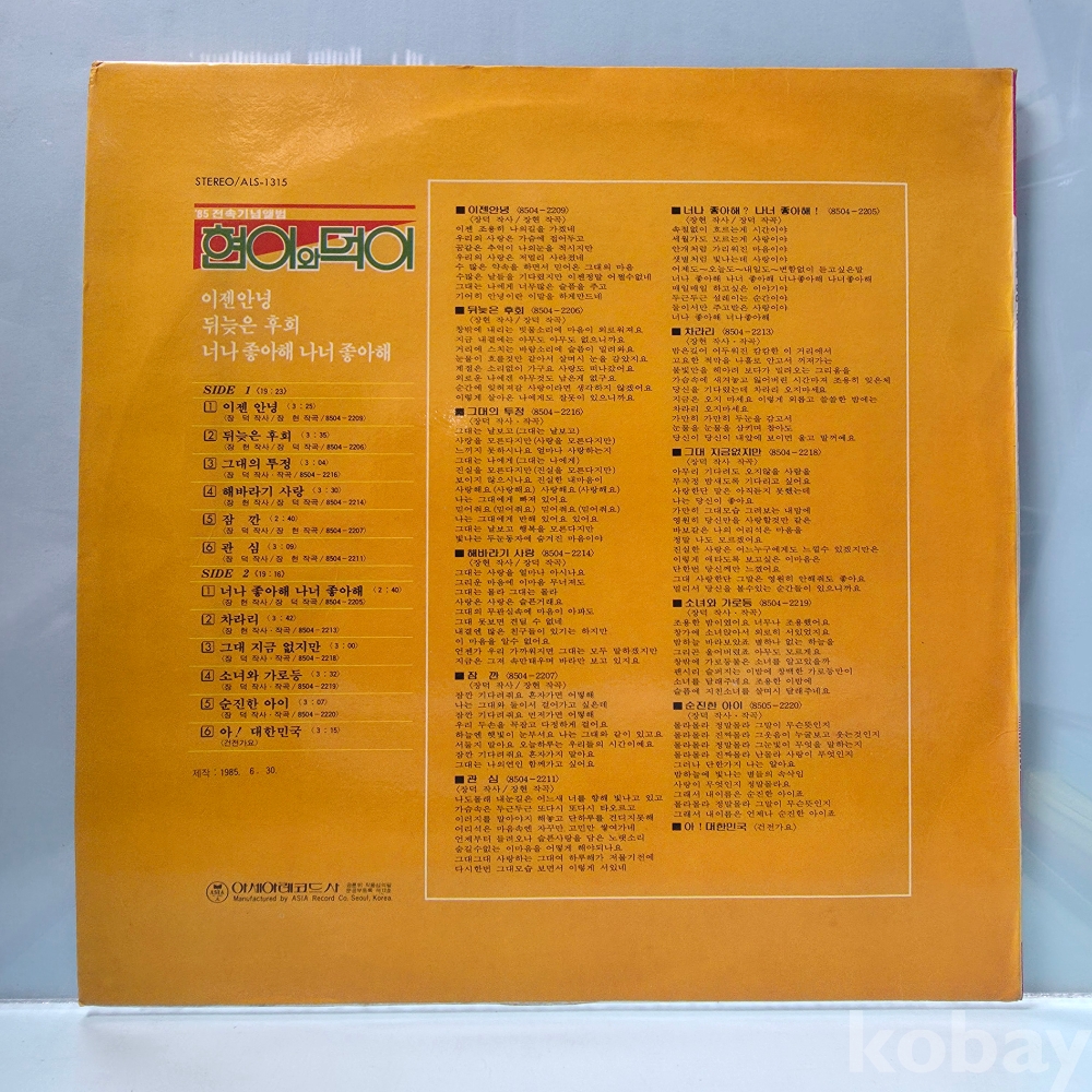 상품 설명 | Side A 1. 이젠 안녕 2. 뒤늦은 후회 3. 그대의 투정 4. 해바라기 사랑 5. 잠깐 6. 관심 Side B 1. 너나 좋아해? 나너 좋아해! 2. 차라리 3. 그대 지금 없지만 4. 소녀와 가로등 5. 순진한 아이 6. 아! 대한민국 |