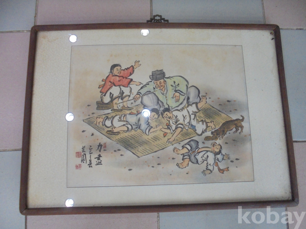 을사 1964년 심술굳게그린 상태 깨끗한 아이들 팔씨름하는 풍속도민화 액자 가로세로 63 x 45 cm 외사진참조