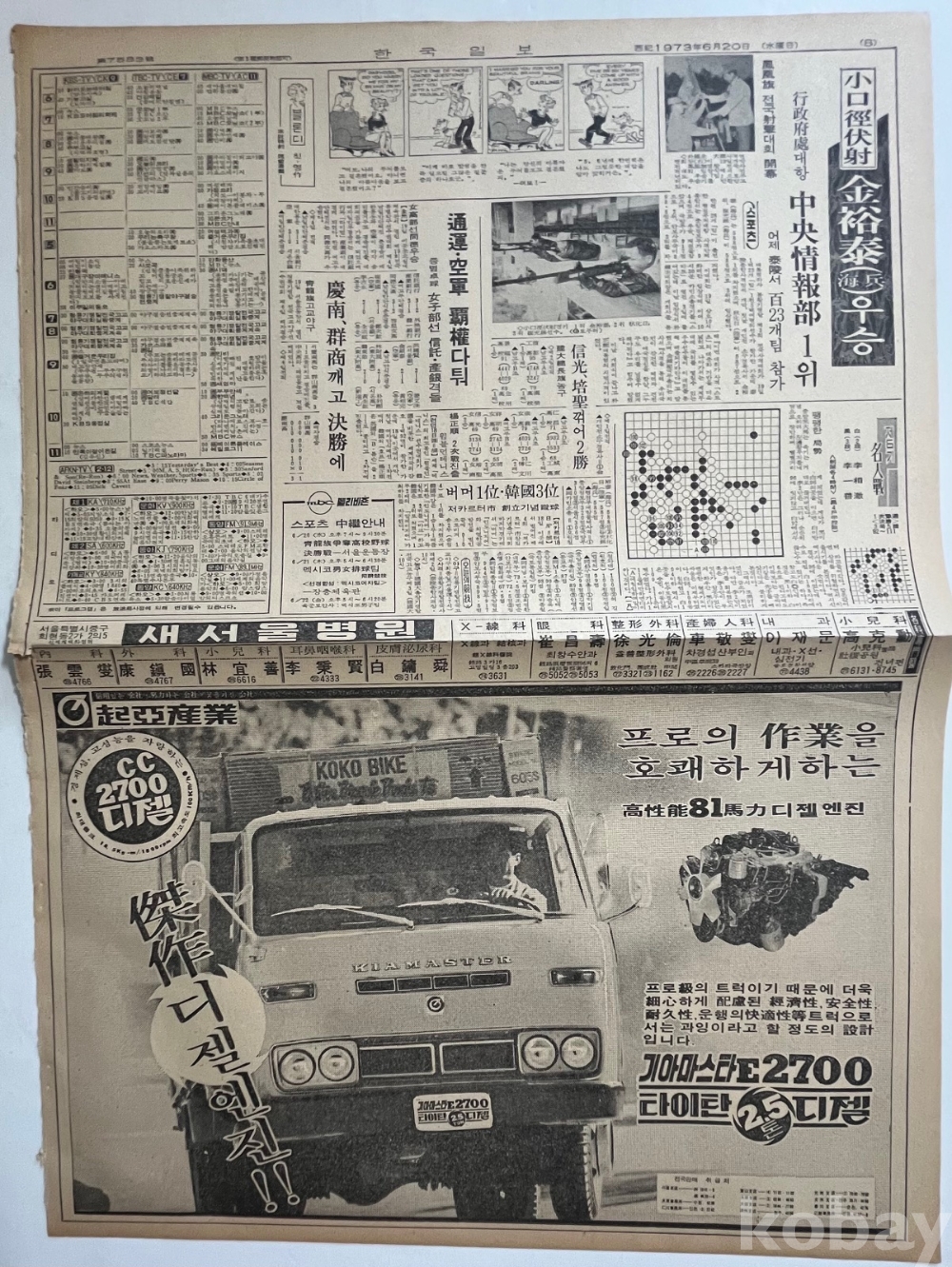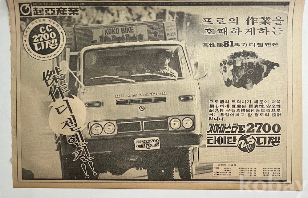 기아산업 트럭 광고가 실린 한국일보 낱장입니다.