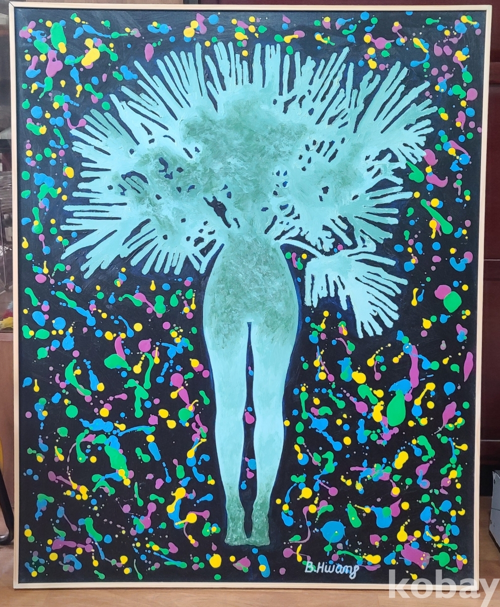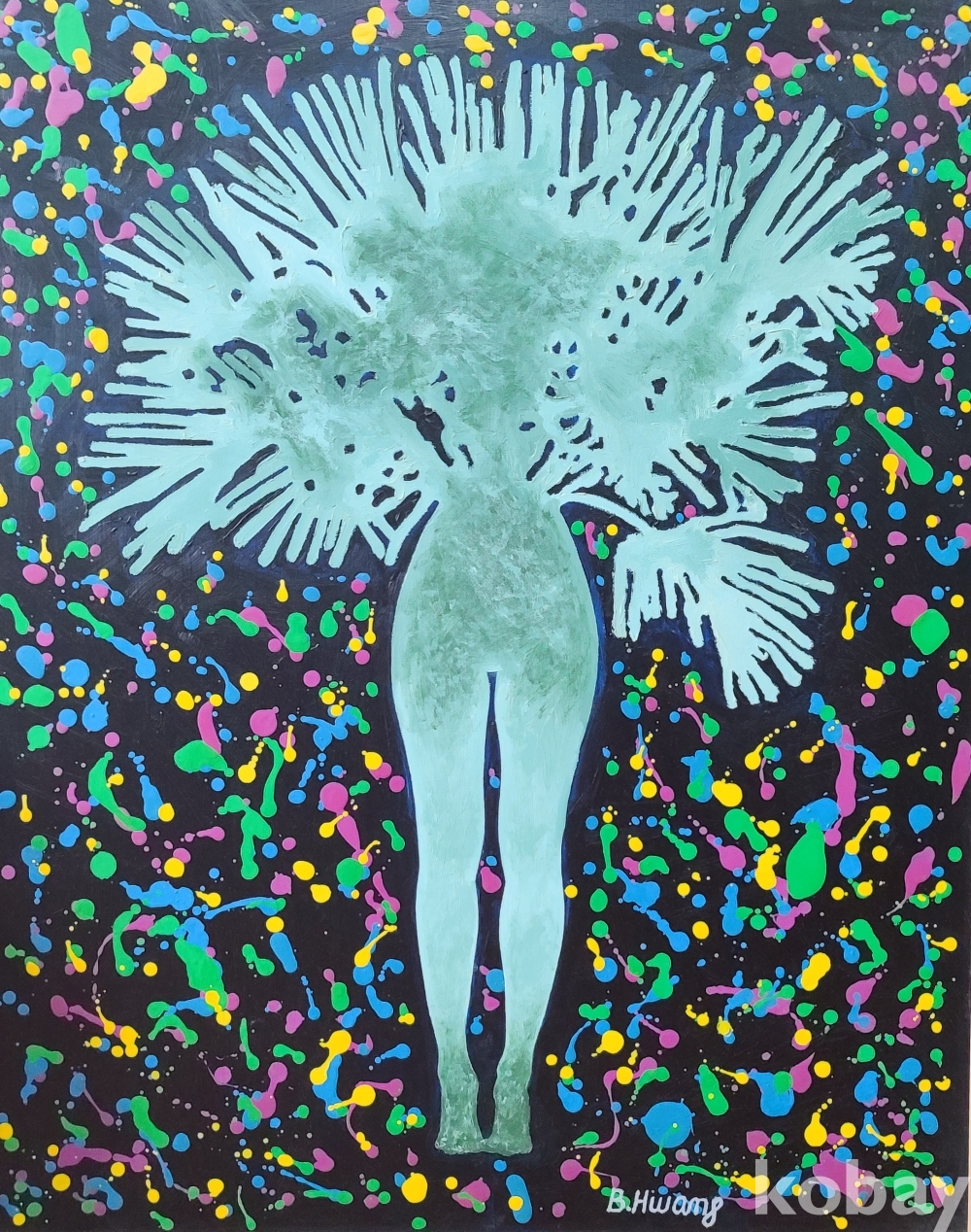 작품의 중앙에는 인체 실루엣이 서 있으며, 이를 둘러싼 다채로운 색채의 유채 물감이 폭발하듯 흩뿌려져 있다. 검은 배경 위에서 노랑, 초록, 파랑, 분홍 등이 교차하며 만들어내는 시각적 리듬은 생명 에너지의 분출과 우주적 순환을 암시한다.