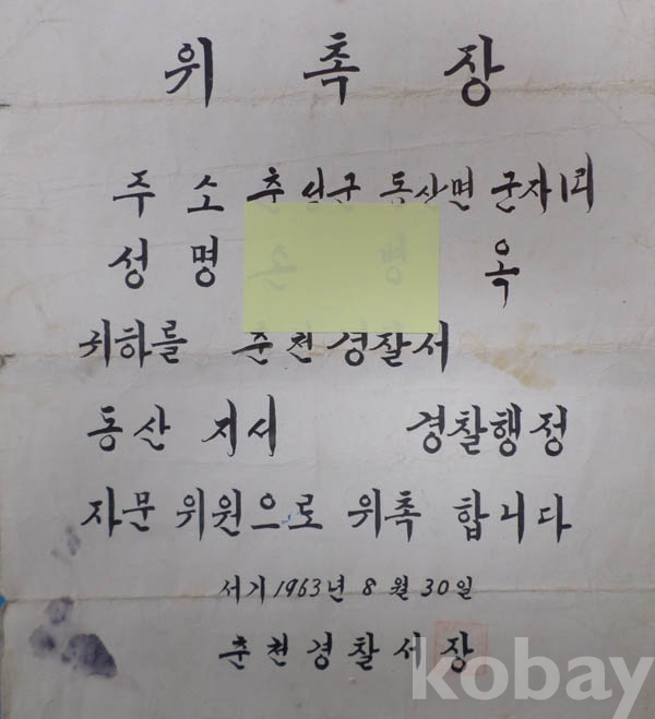 **** [경찰자료] 1963년 춘천경찰서장 위촉장