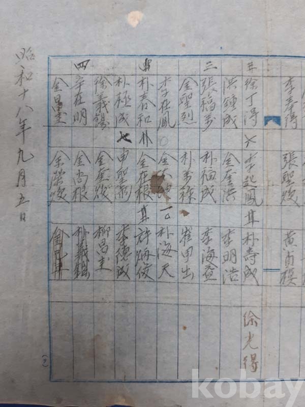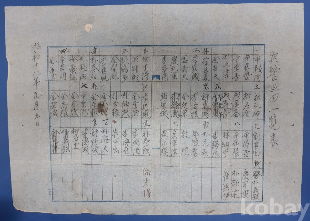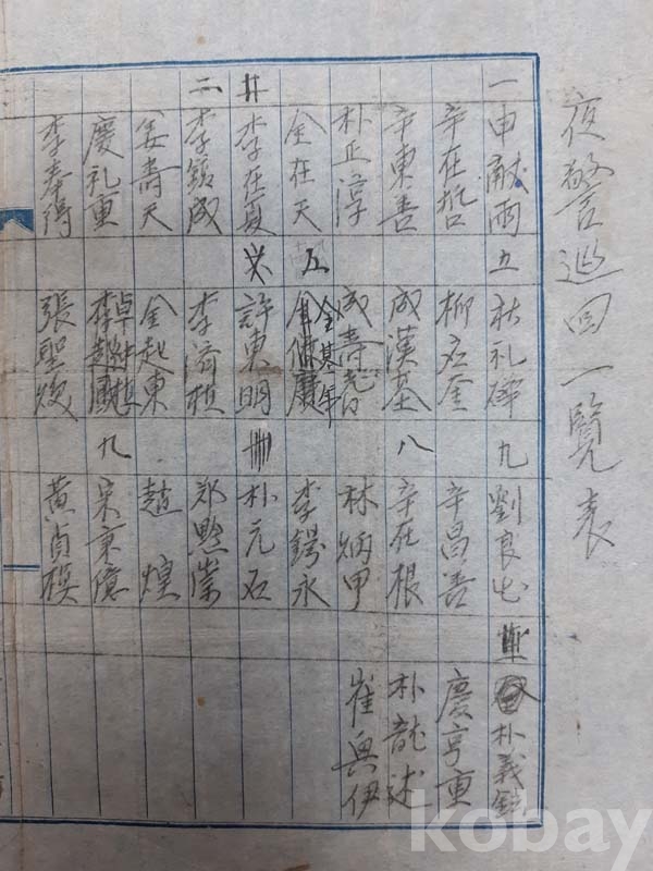 소화18년(1943년) 夜警巡回一覽表 모두 10개조로 총 65명의 명단이 실려있다