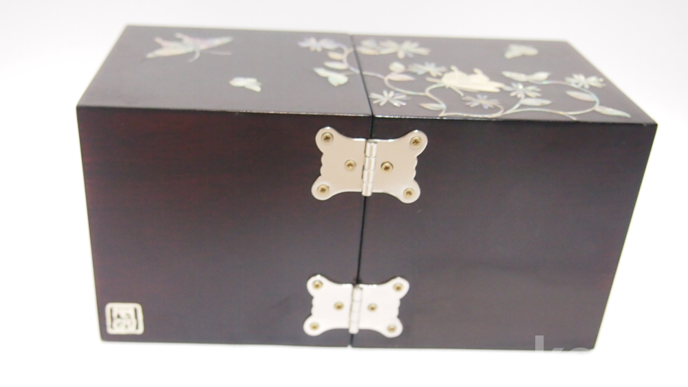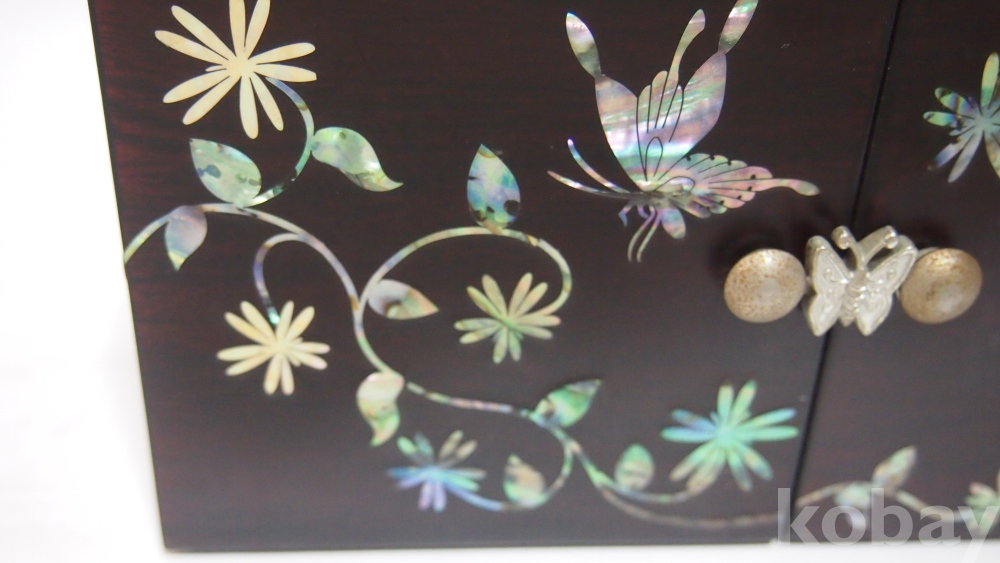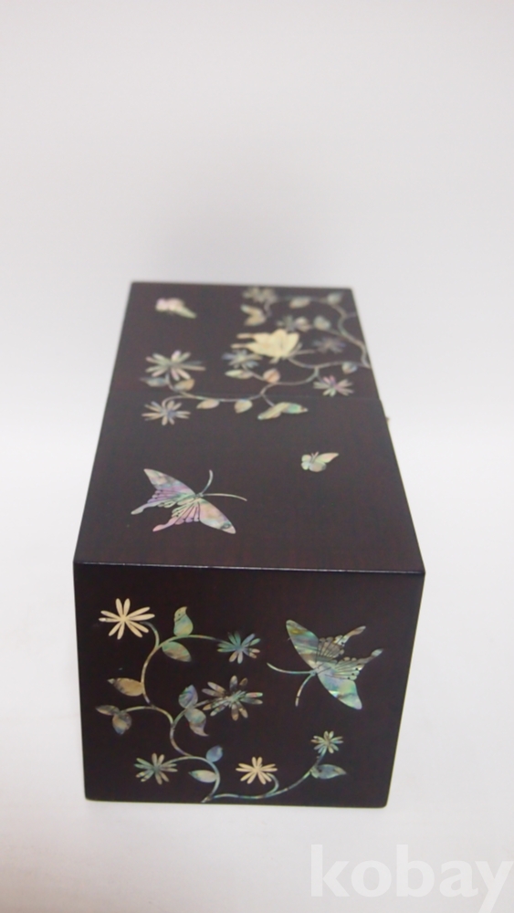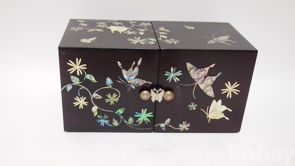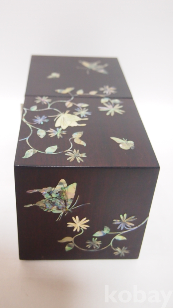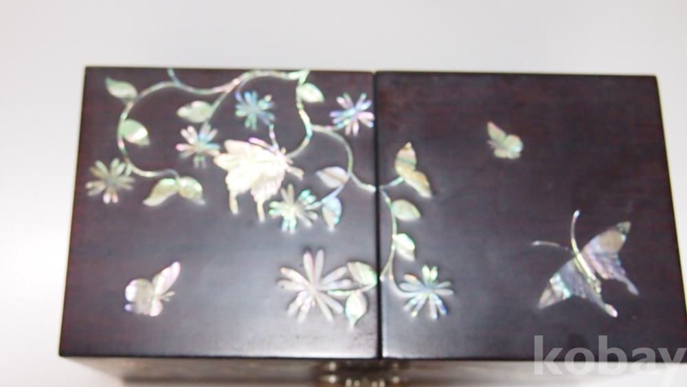 전통 나전(자개)칠기 공예 작품/고급 접이식 쌍둥이 나비 당초문 보석함입니다.