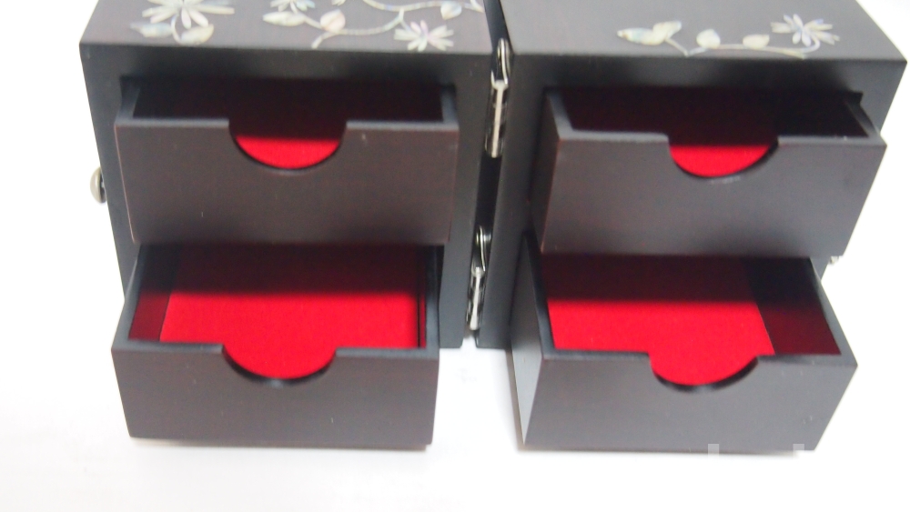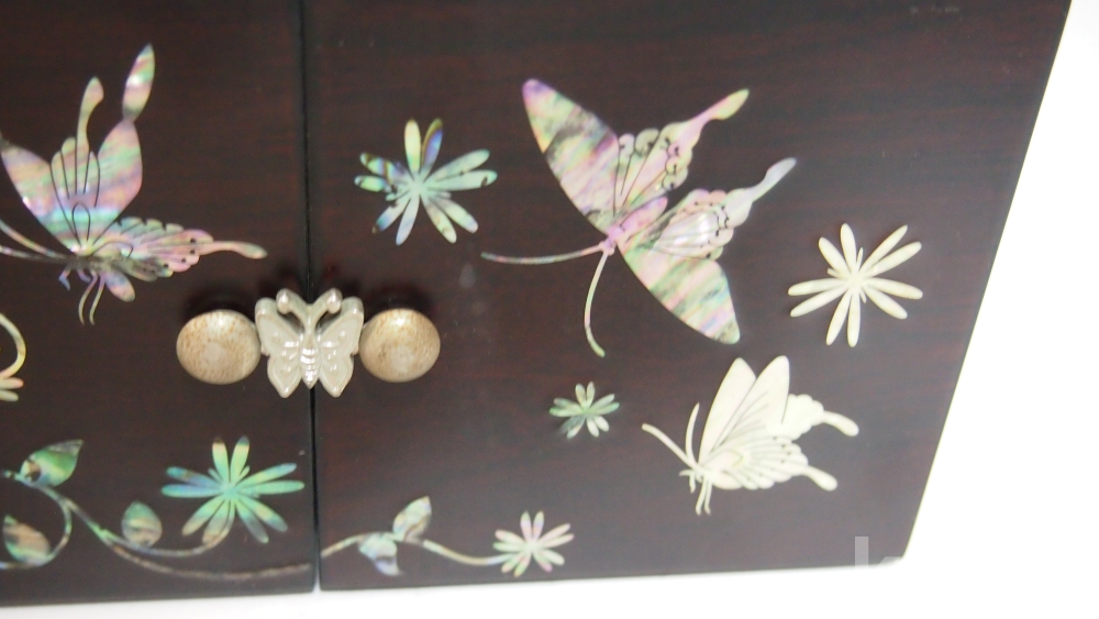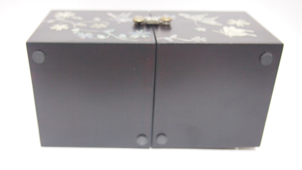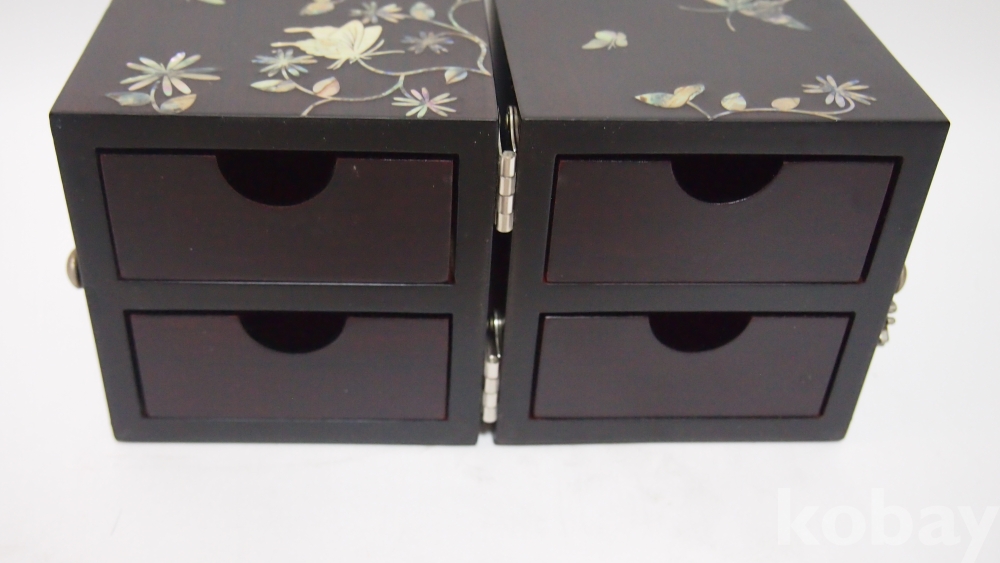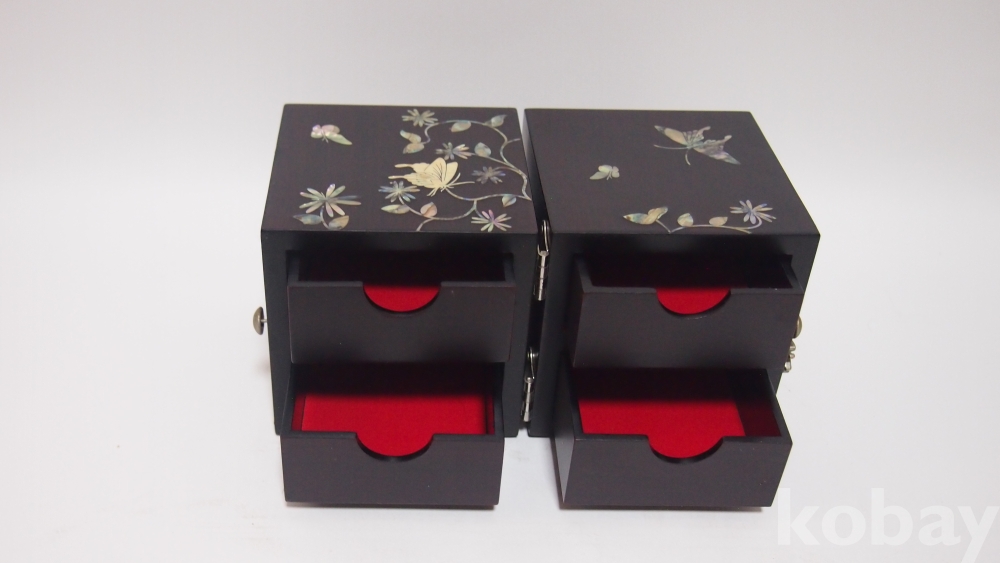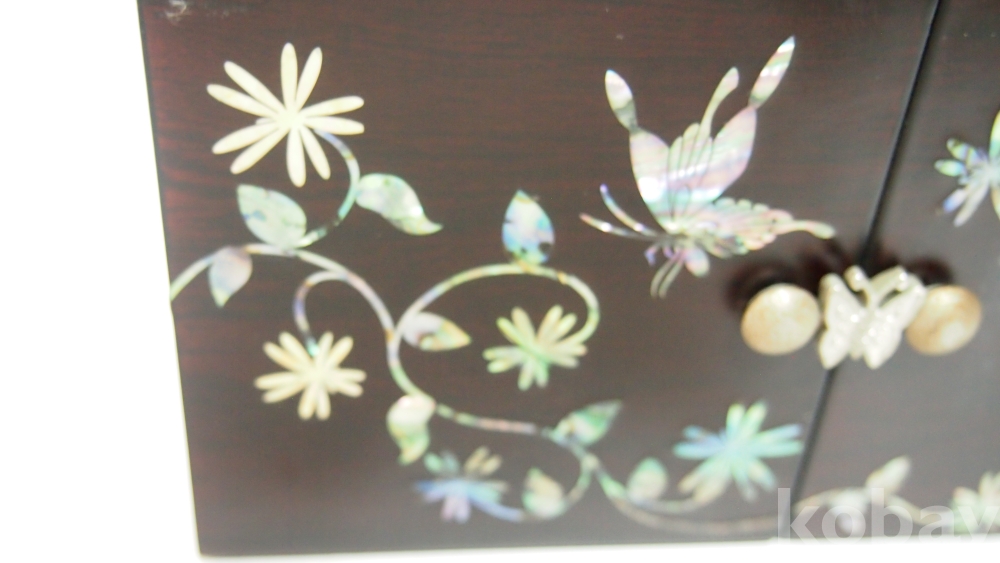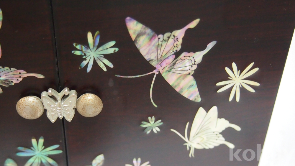 전통 나전(자개)칠기 공예 작품/고급 접이식 쌍둥이 나비 당초문 보석함입니다.