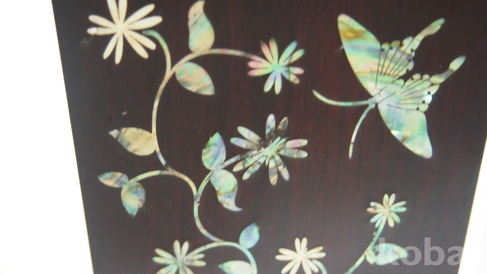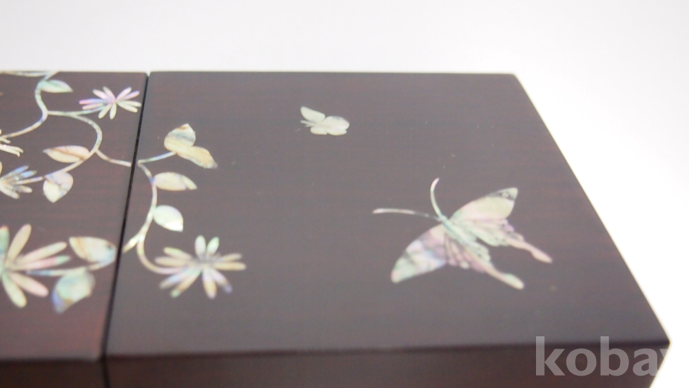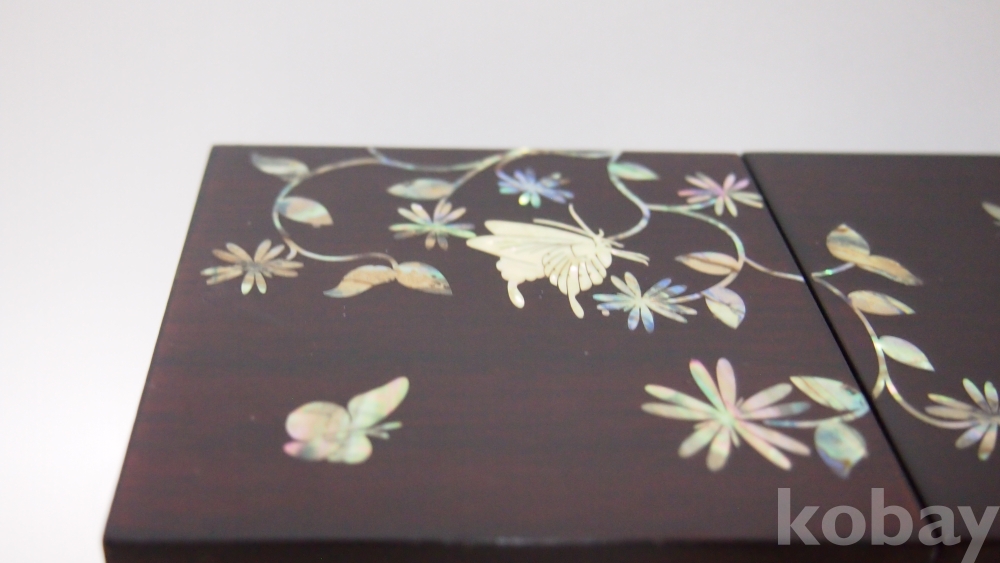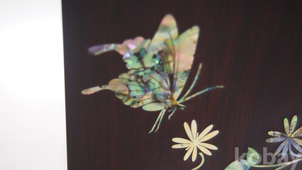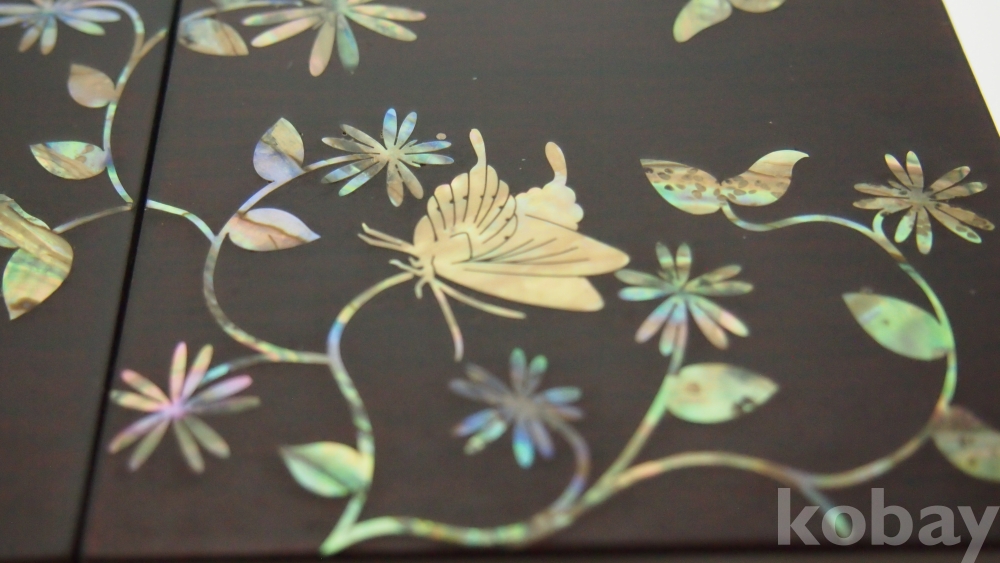 자개는 현재 진주패·야광패·멕시코패·홍패 등 수입품이 많아서 주름질이 한층 다채로워진 편인데, 오히려 나전이 안고 있는 과제는 자개라는 재료의 문제보다도 목물(木物)에서 문양 장식에 이르는 의장상의 안목에 있으며, 또 좋은 칠을 정제하여 자급하는 문제 등이라 할 수 있습니다.
