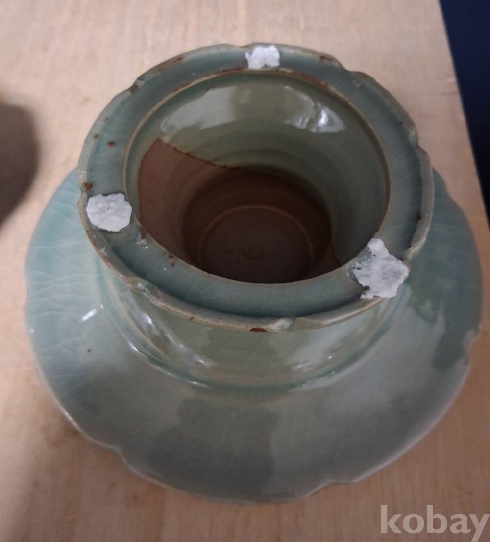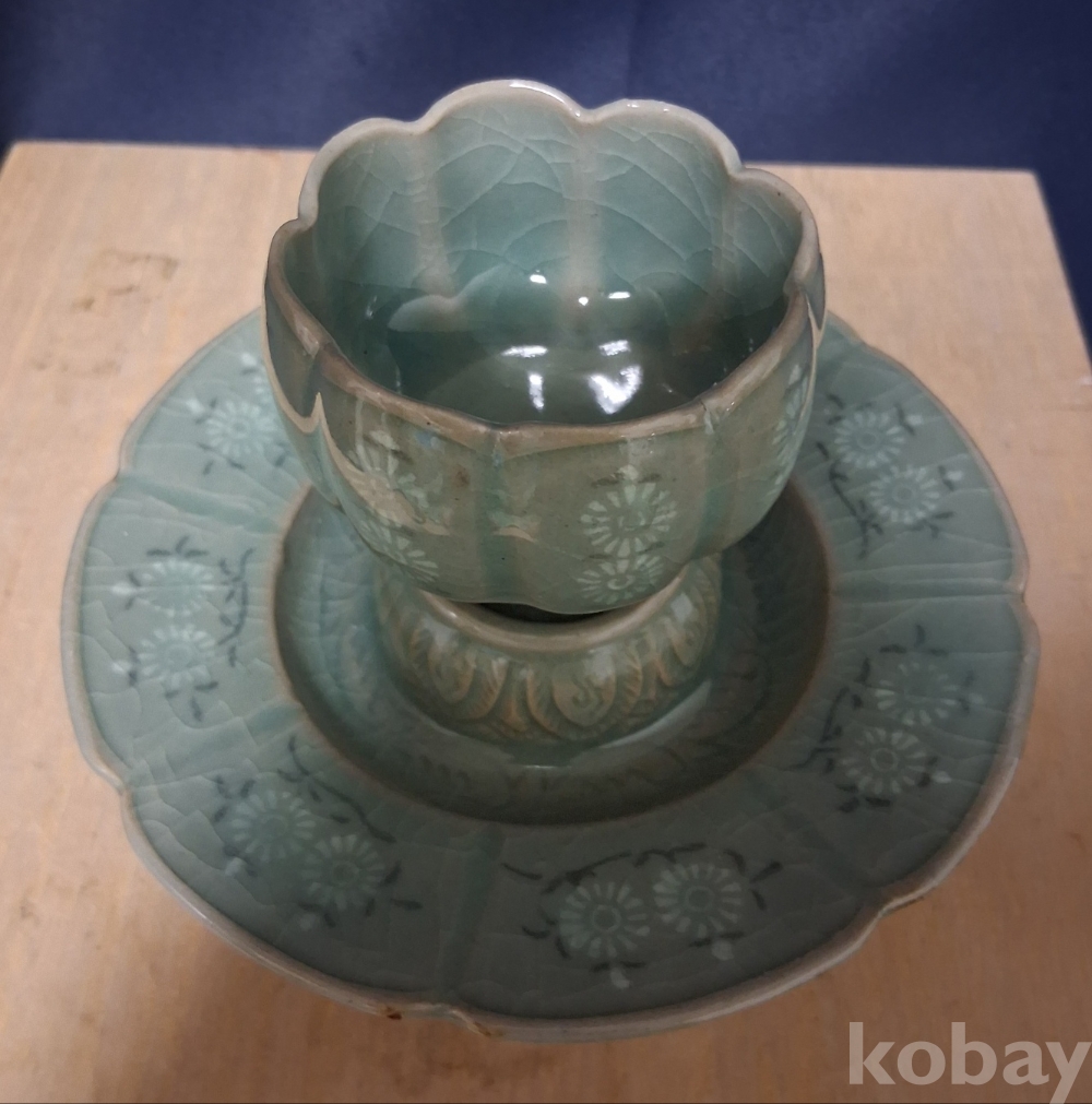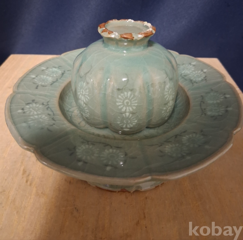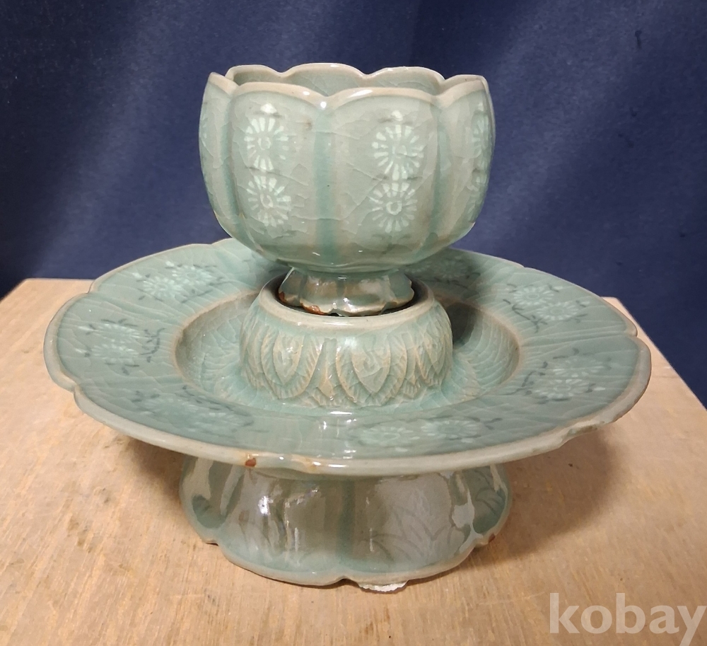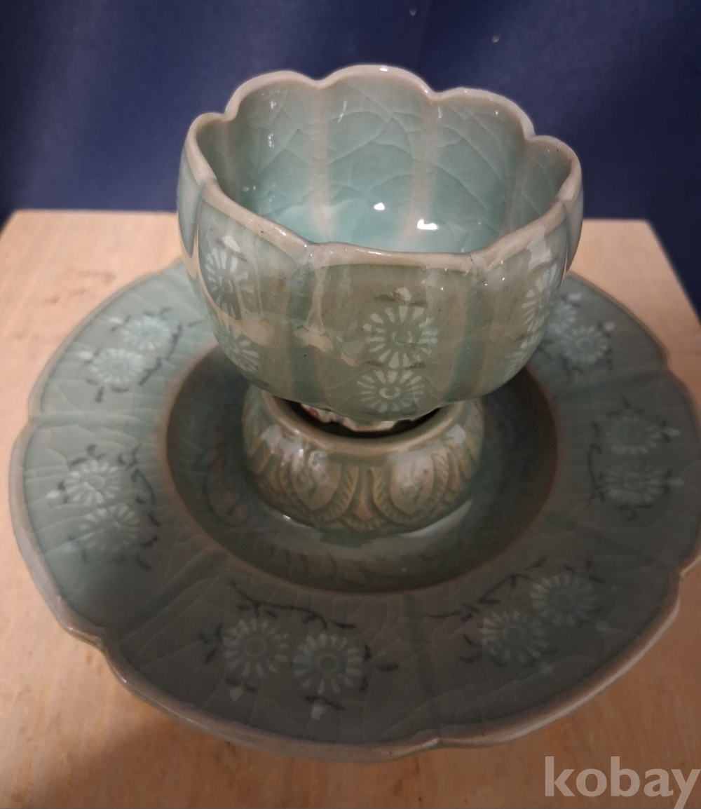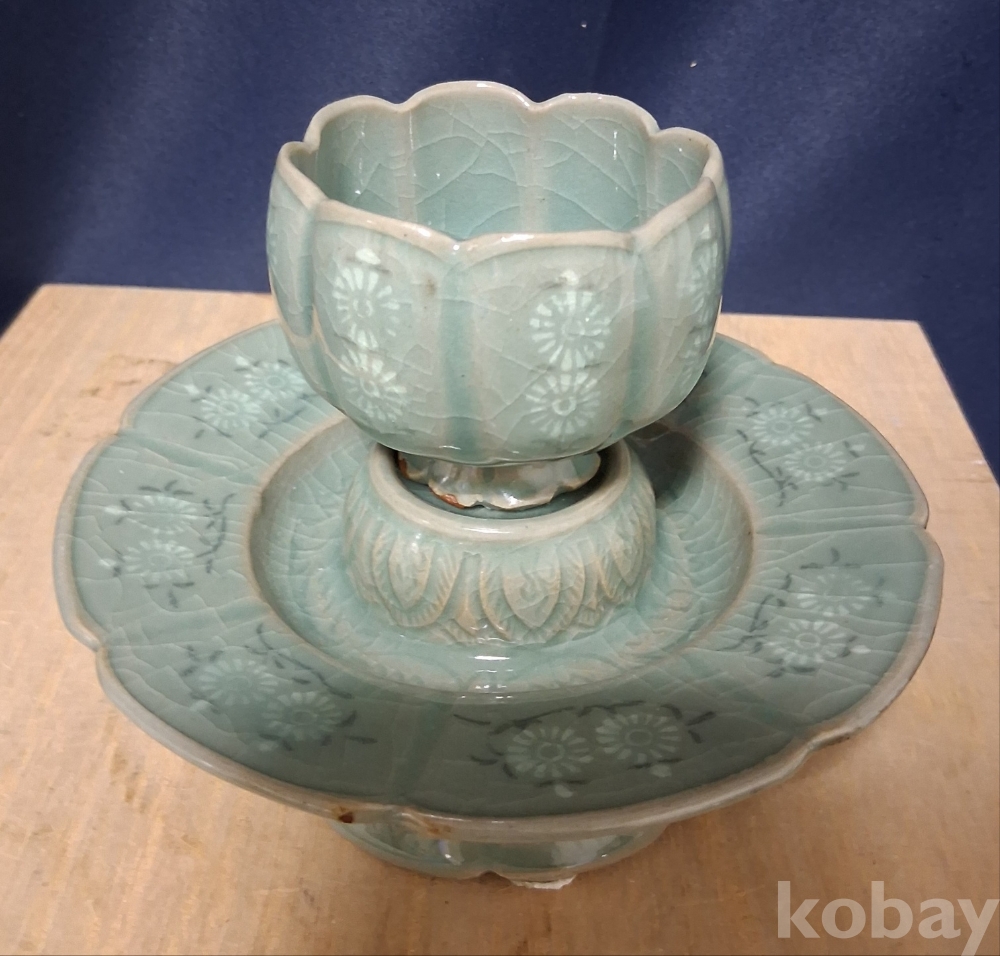 전체적으로 빙열이 아주 잘들어간 청자 잔,잔대입니다.