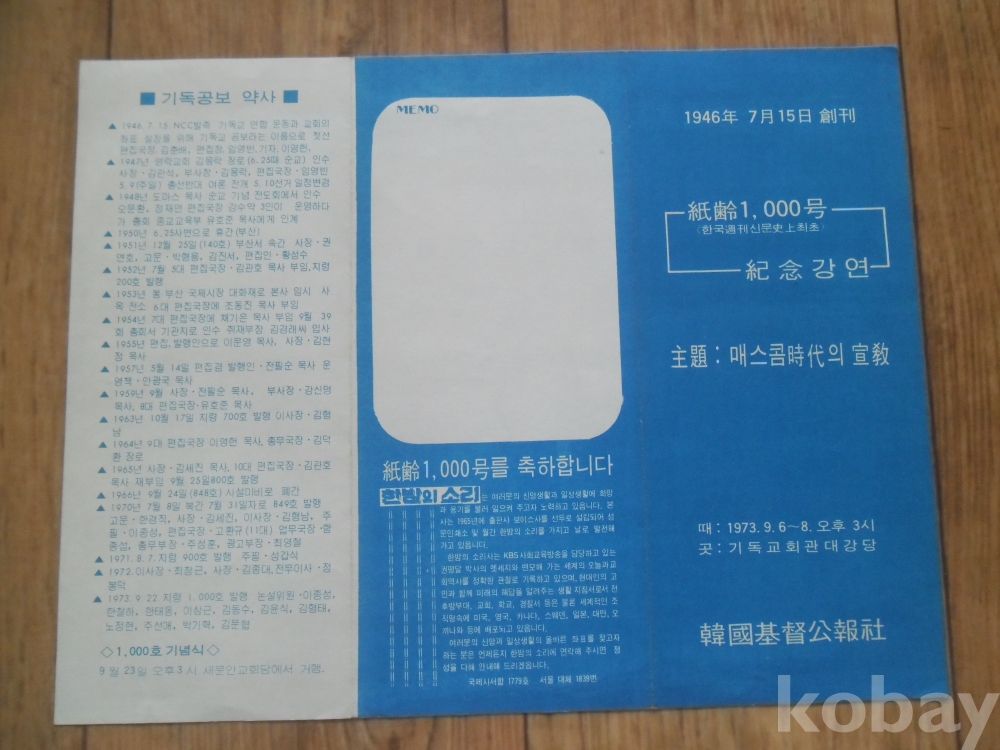 1973년 한국기독공보사 지령 1000호 기념강연 안내장
