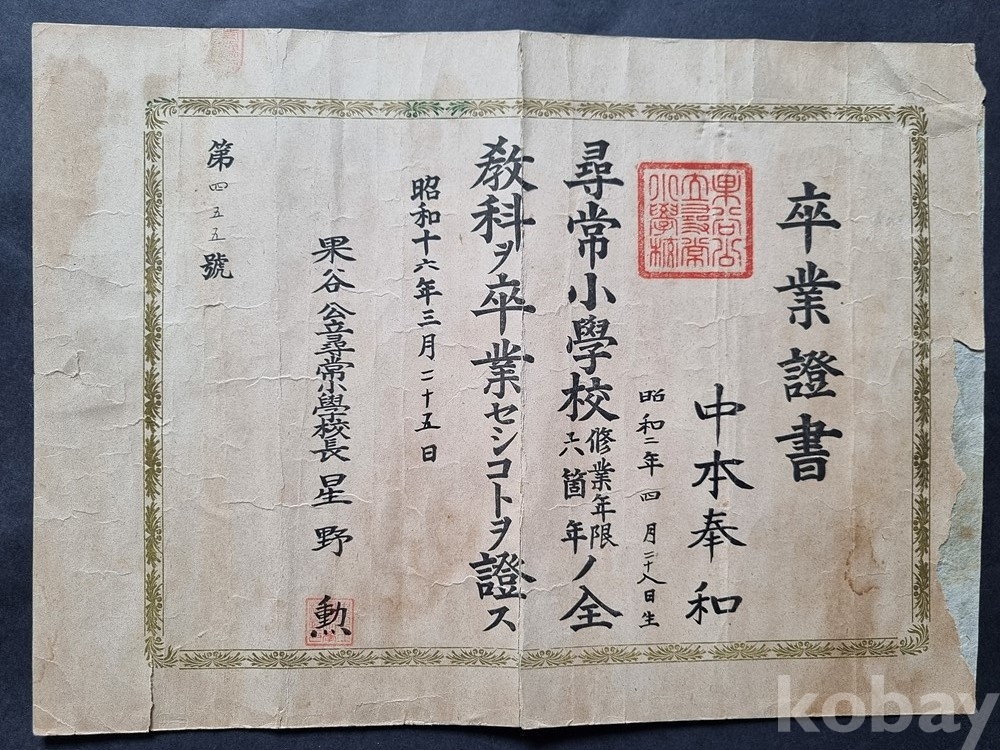 M-31 / (희귀자료) 일제강점기 "졸업증서" (과곡공립심상소학교. 경북 칠곡군 과곡면)