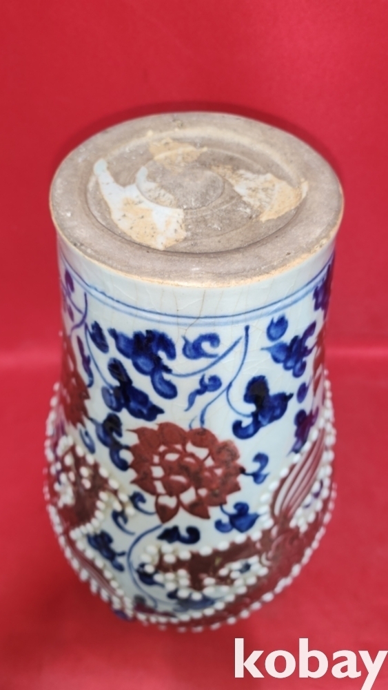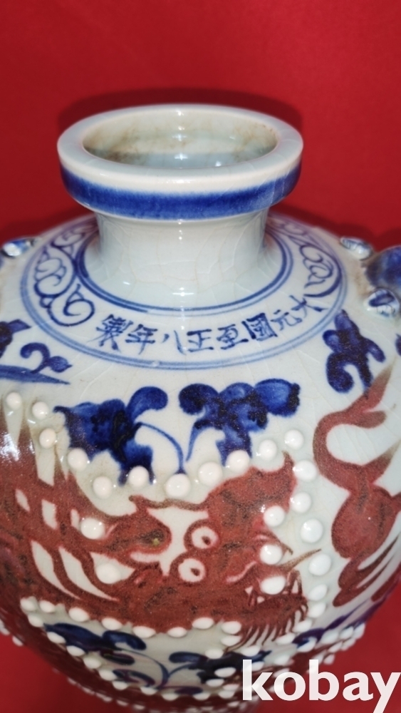 대원국지정팔년제 청화 유리홍 화용(花龍)문 양귀달린 매병입니다,
