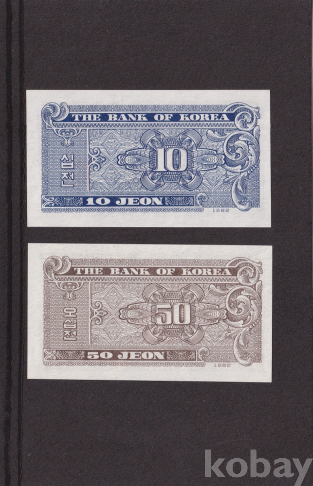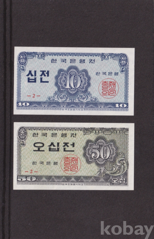 - 한국은행 1962년 소액 십전/오십전 판번호 2번 미사용 지폐 - 2장 일괄