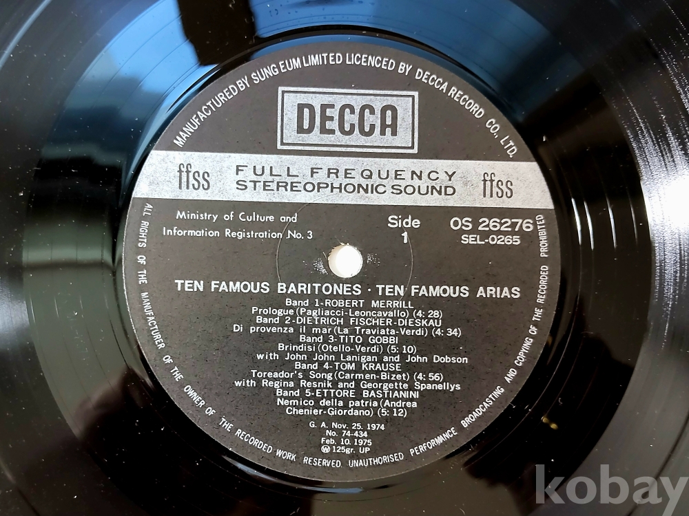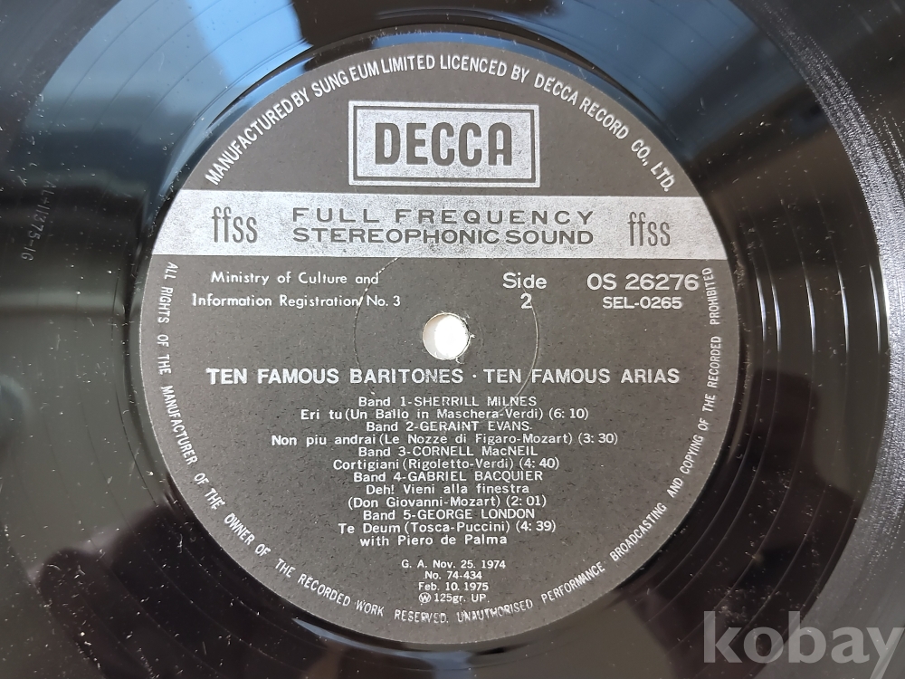 가수의 초상과 이름이 표기된 40여년 전에 그입한 유명 바리톤가수의 아리아 10곡이 수록된 레어 LP음반입니다.