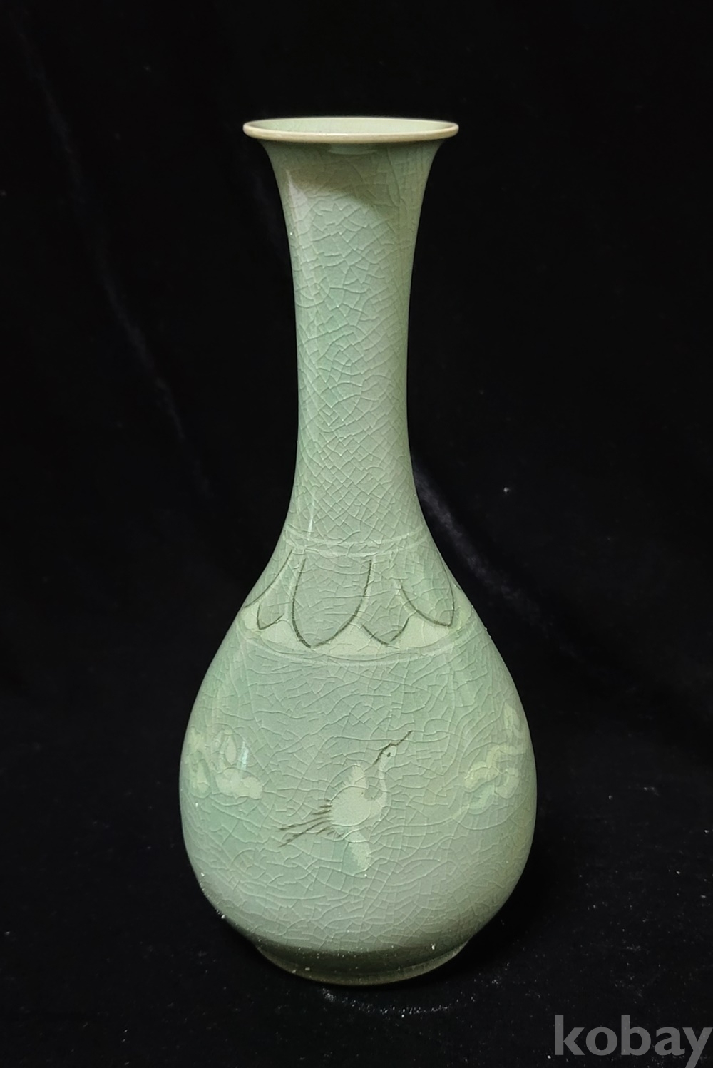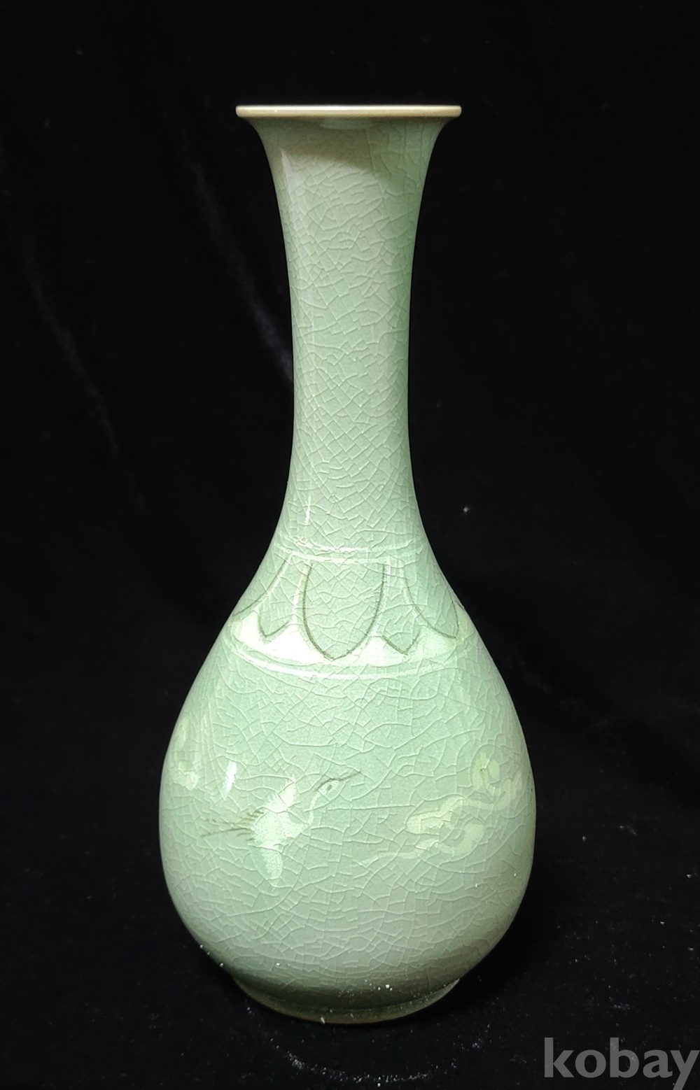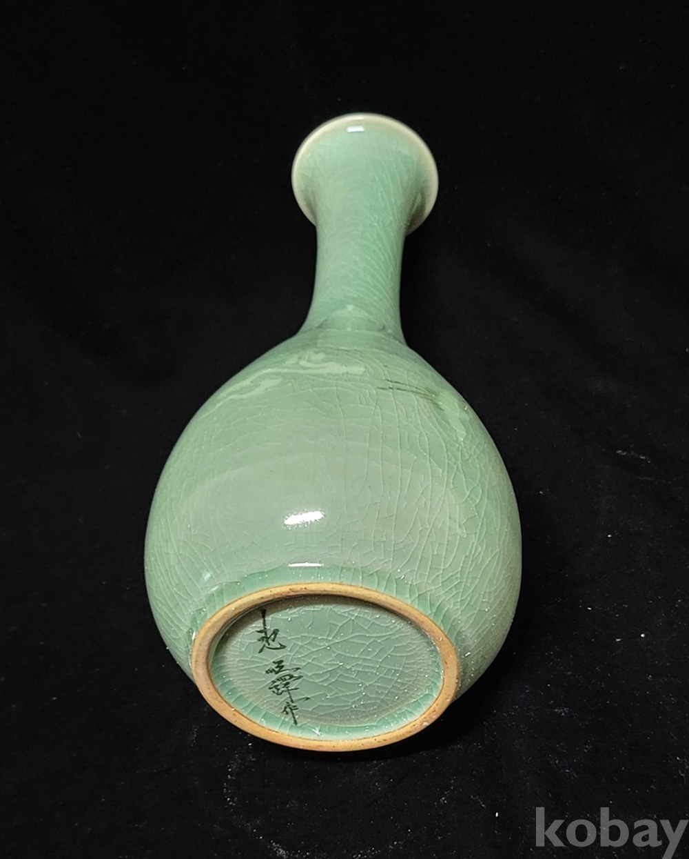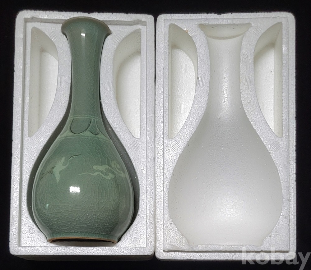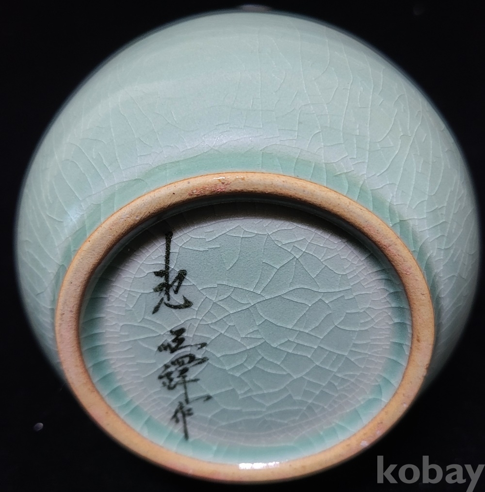 인간문화재 지순탁 池順鐸(1912-1993) 선생님의 청자 흑백상감 운학문 주병으로 굽 “池順鐸 作” 수결에 형태 바르고 상태 완벽합니다.