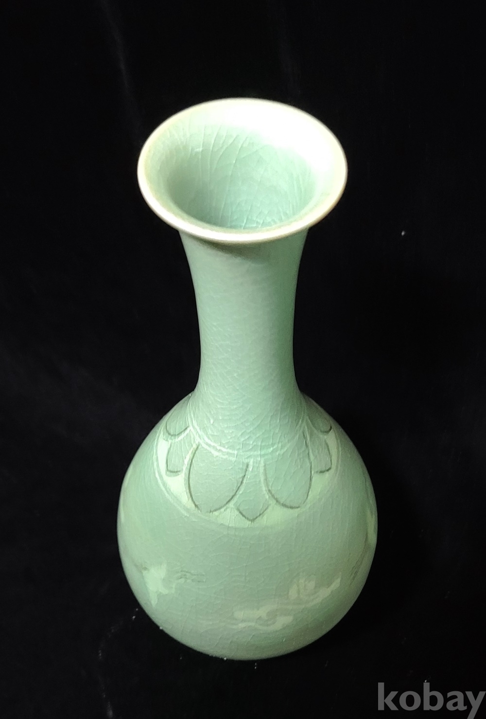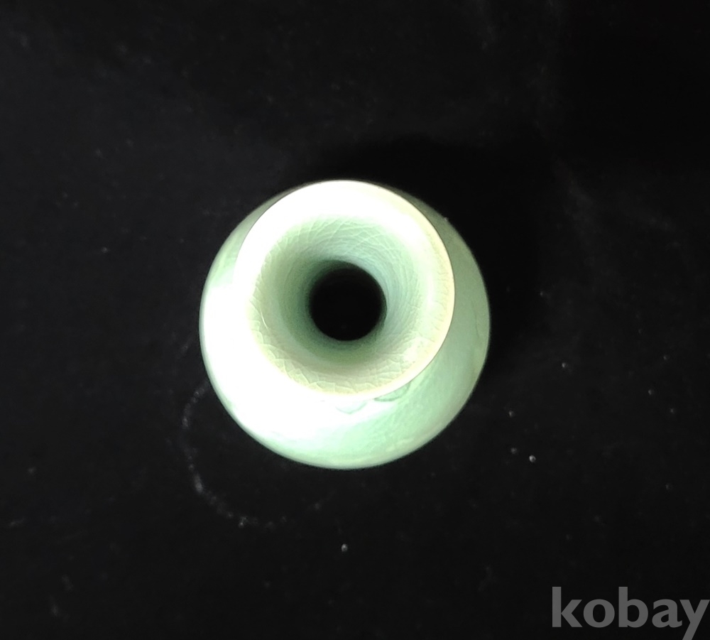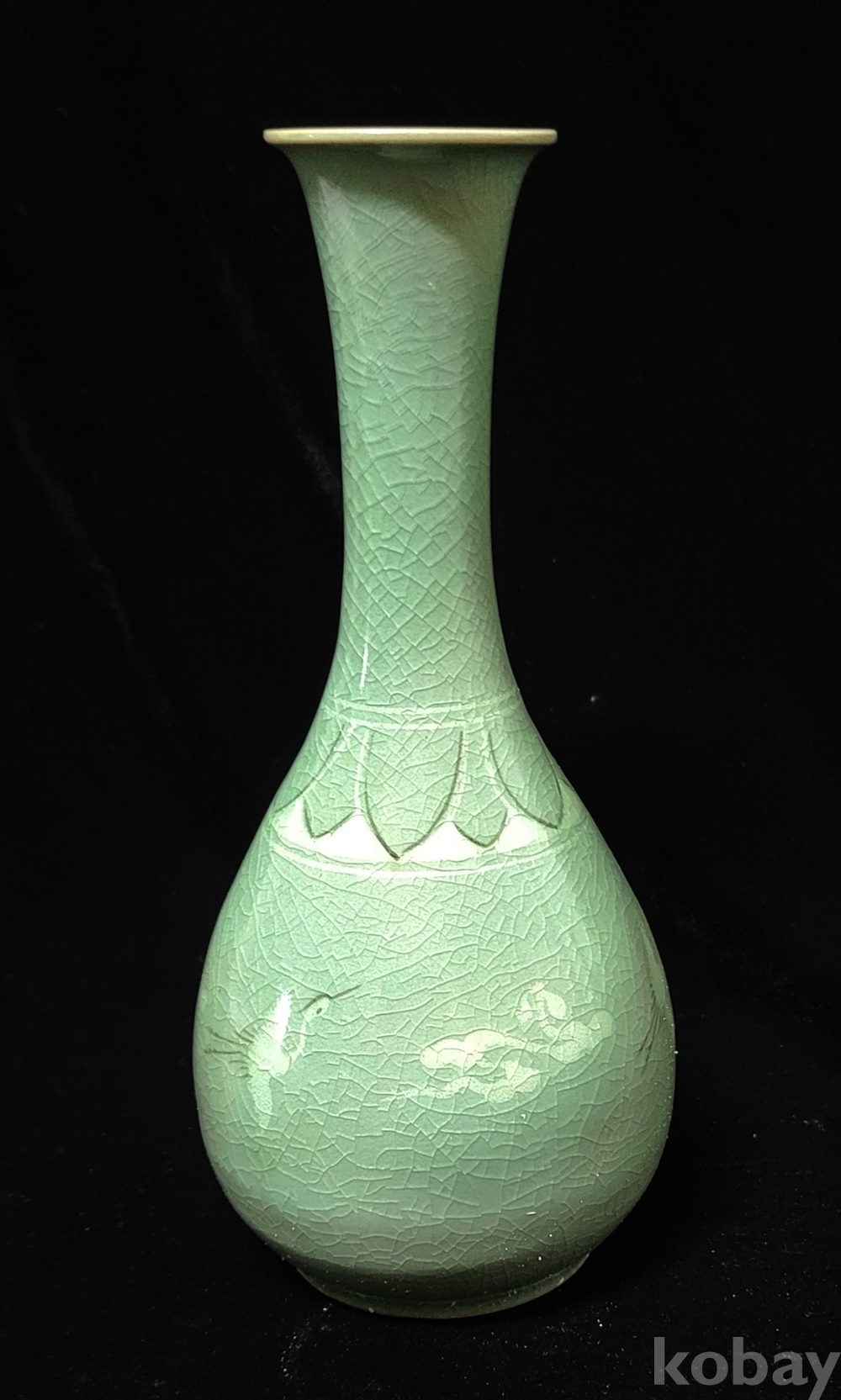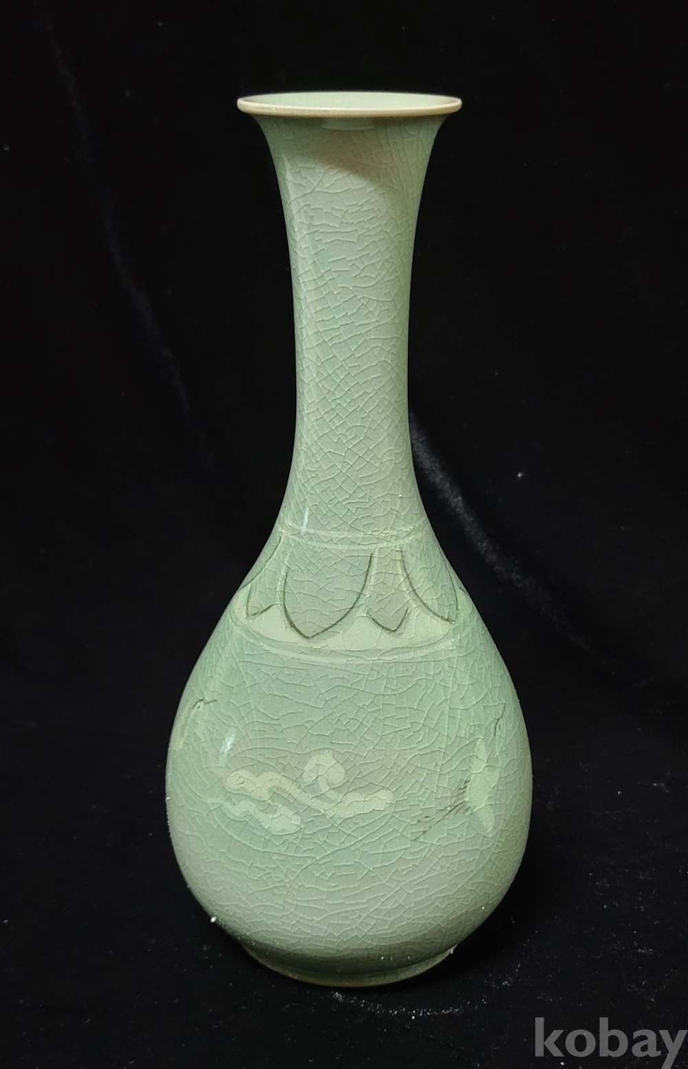 인간문화재 지순탁 池順鐸(1912-1993) 선생님의 청자 흑백상감 운학문 주병으로 굽 “池順鐸 作” 수결에 형태 바르고 상태 완벽합니다.