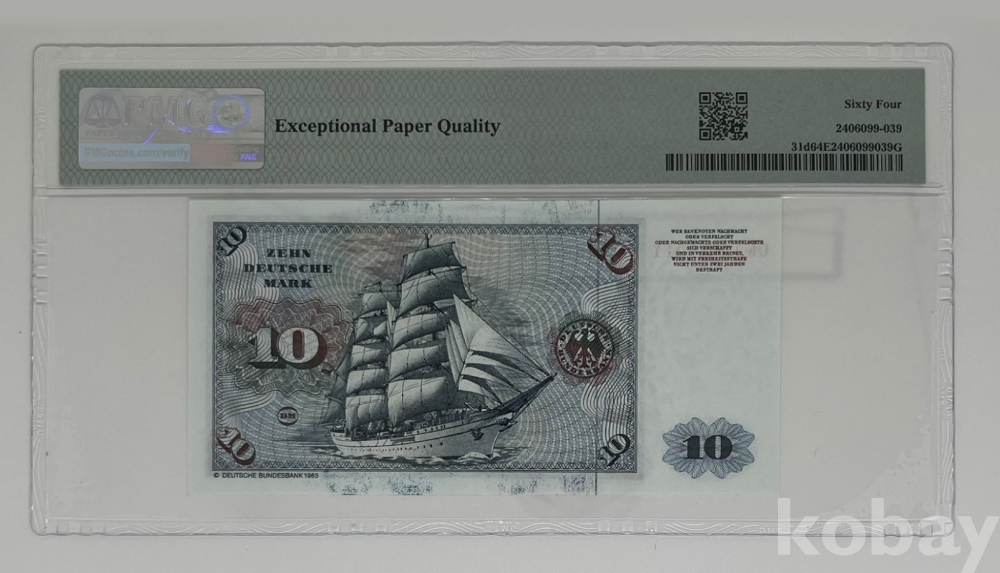 이 지폐는 독일 연방공화국(Federal Republic of Germany) 10 마르크 (Deutsche Mark, DM) 1980년 발행권입니다. PMG에서 Choice Uncirculated 64 EPQ로 평가된 개체입니다.