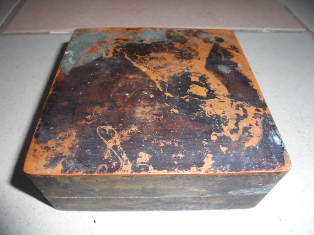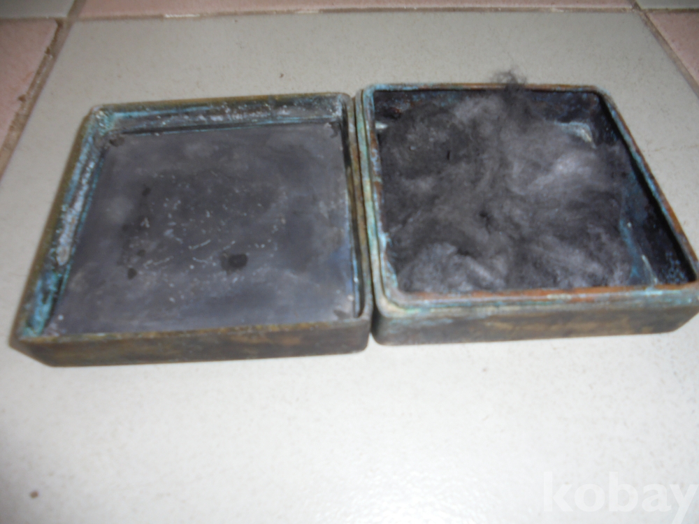 오래된 휴대용 먹물사각통으로 위에 괴석과 화조도 그려져있고 안에 먹물보호되는 솜이들어있고 두터운유기로 만들어 무거운 오래된 휴대용