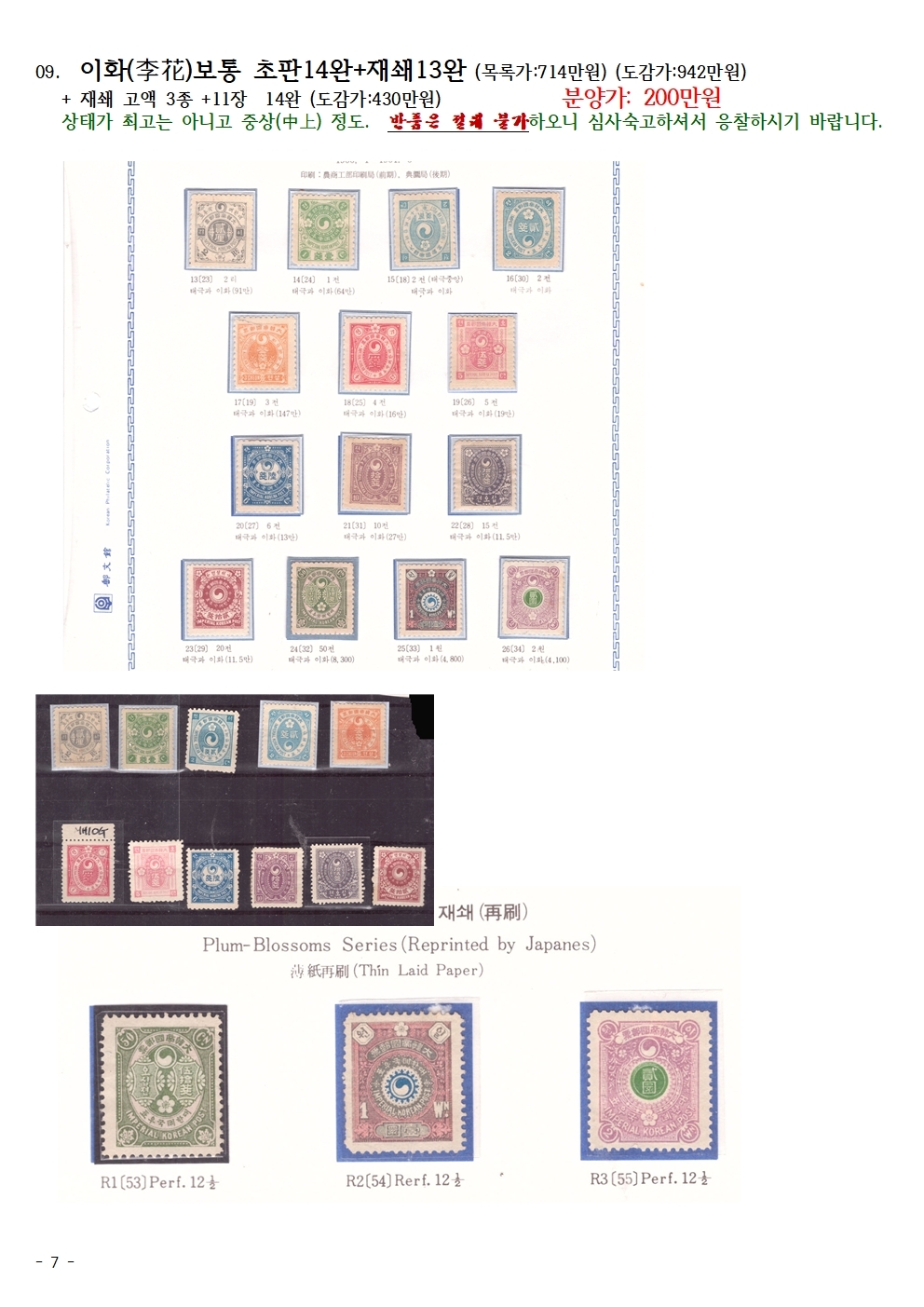 이화(李花)보통우표 초판14완+재쇄13완 (목록가:714만원) (도감가:942만원)+재쇄 3종 430만원