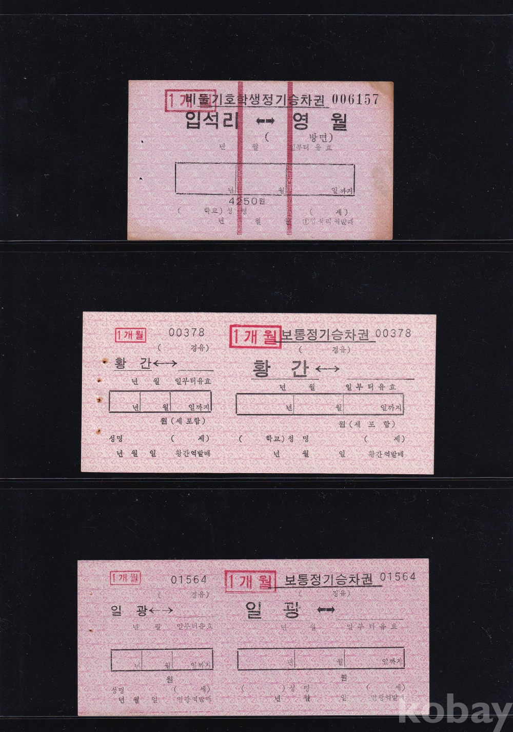 - [기차, 전철, 버스 승차권 모음展] - 비둘기호 학생 및 일반 정기(1개월) 승차권 3종 일괄