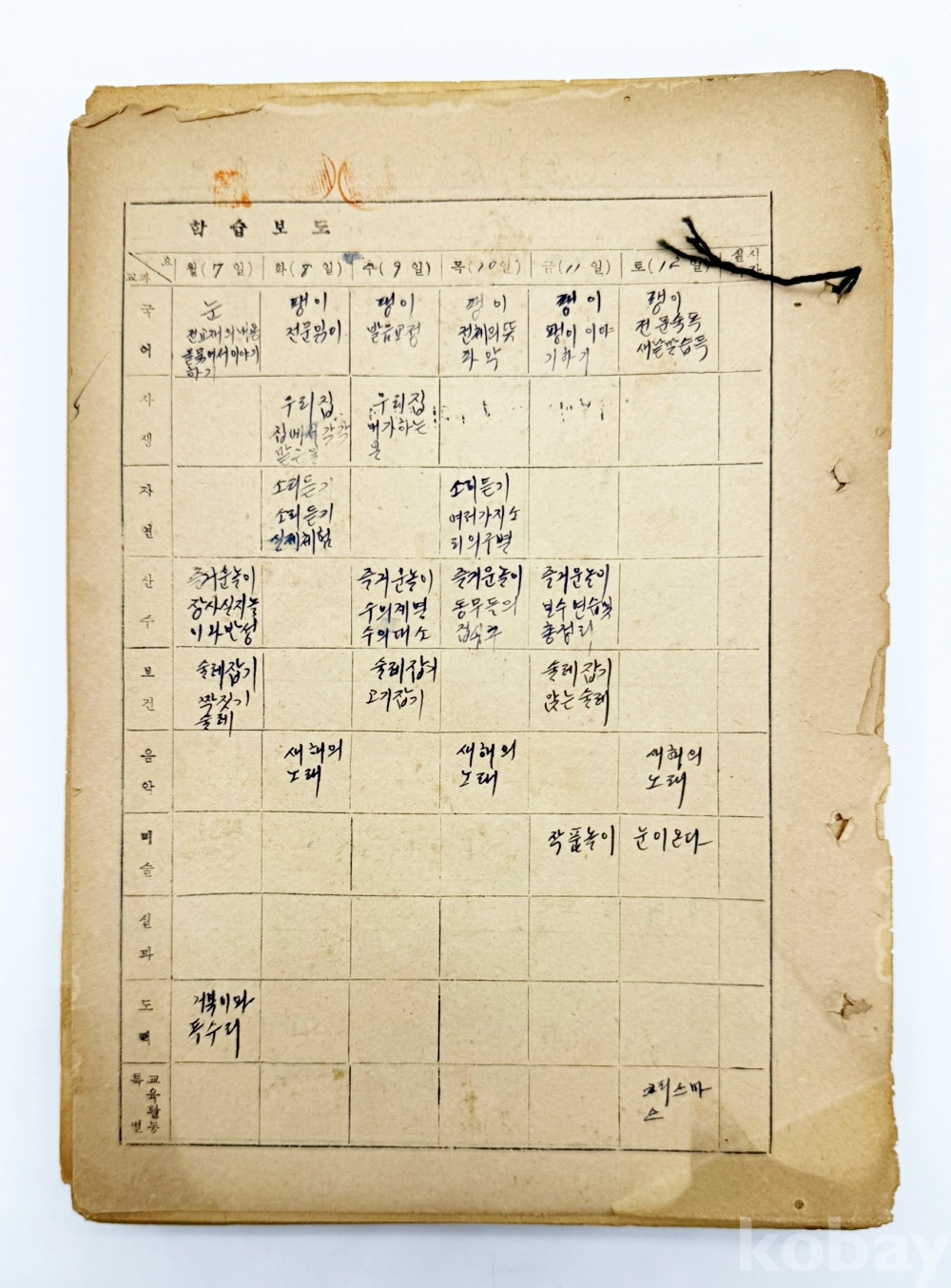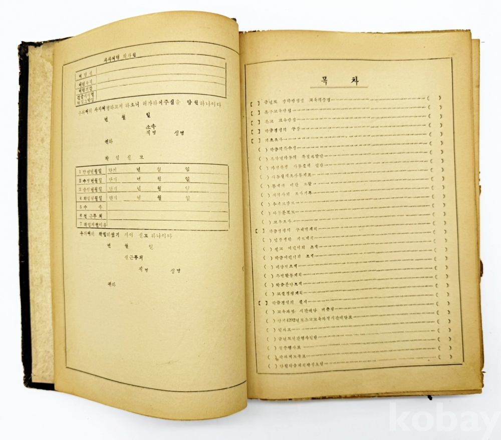 상품 설명 | 1959년 충청남도 보령 소재의 관창국민학교에서 1학년을 담당하였던 교원이 수업과 학급 경영 내용을 기록한 '교육기록' 파일철 1점이다. 교원이 기록한 내용으로는 학급 경영 구상과 학급 기초 조사, 교우조사도, 성적일람표 등 상세한 내용이 수록되어 있다. | ||