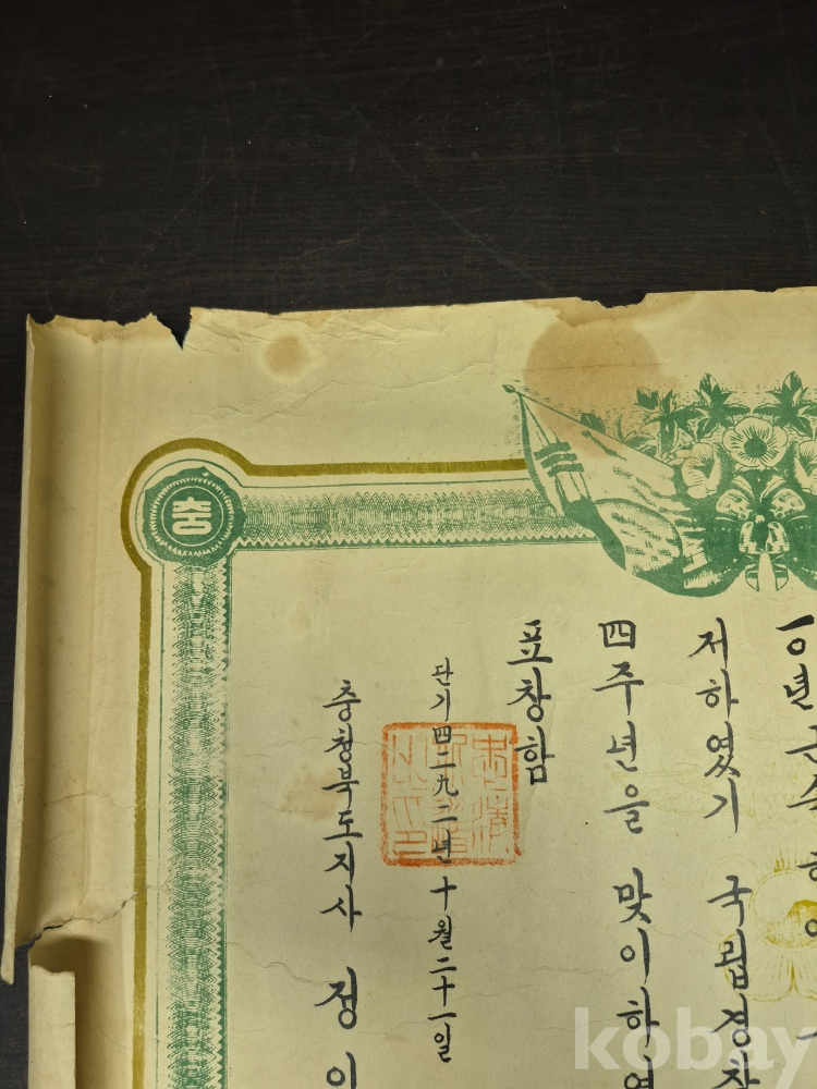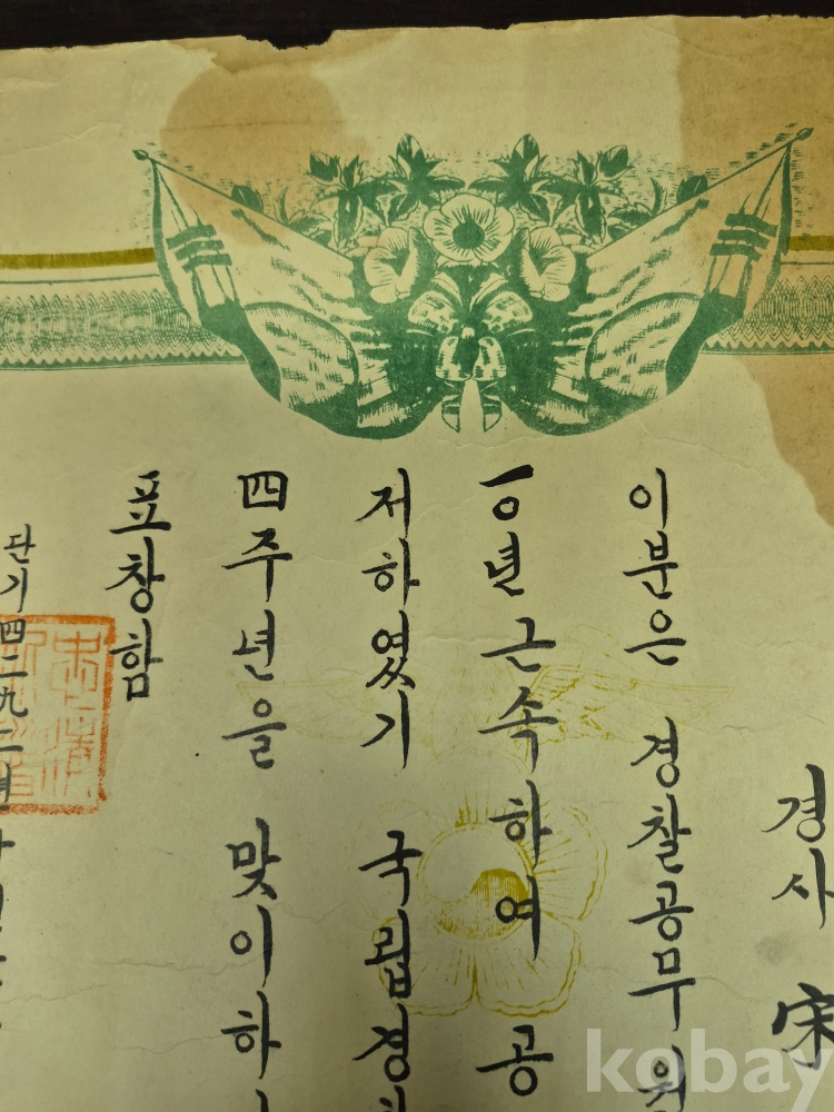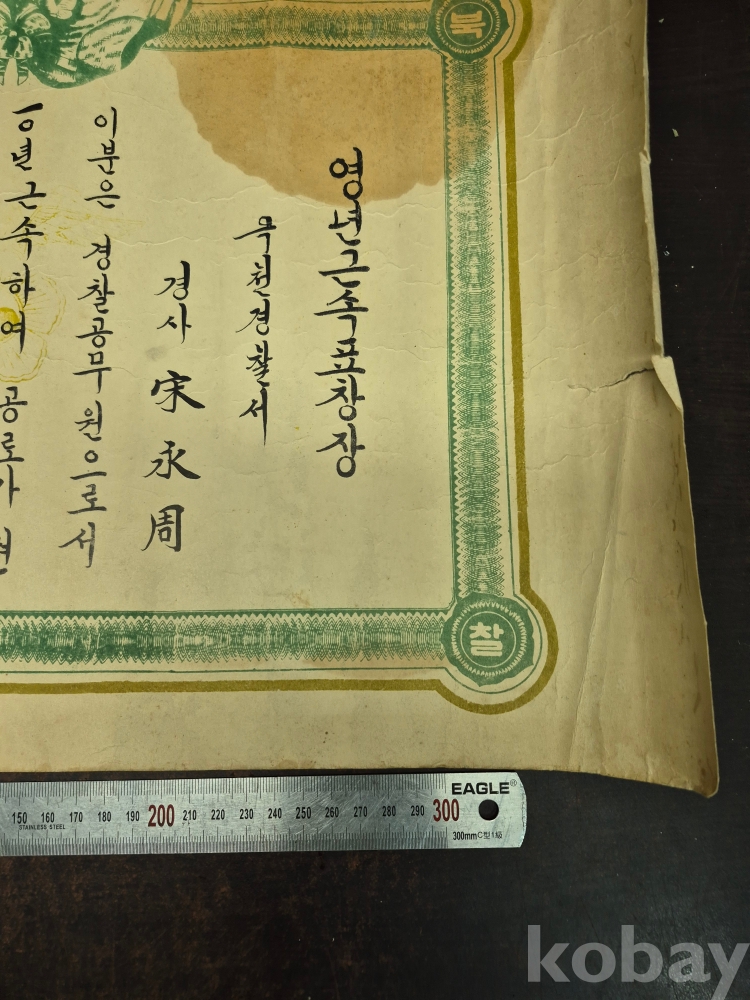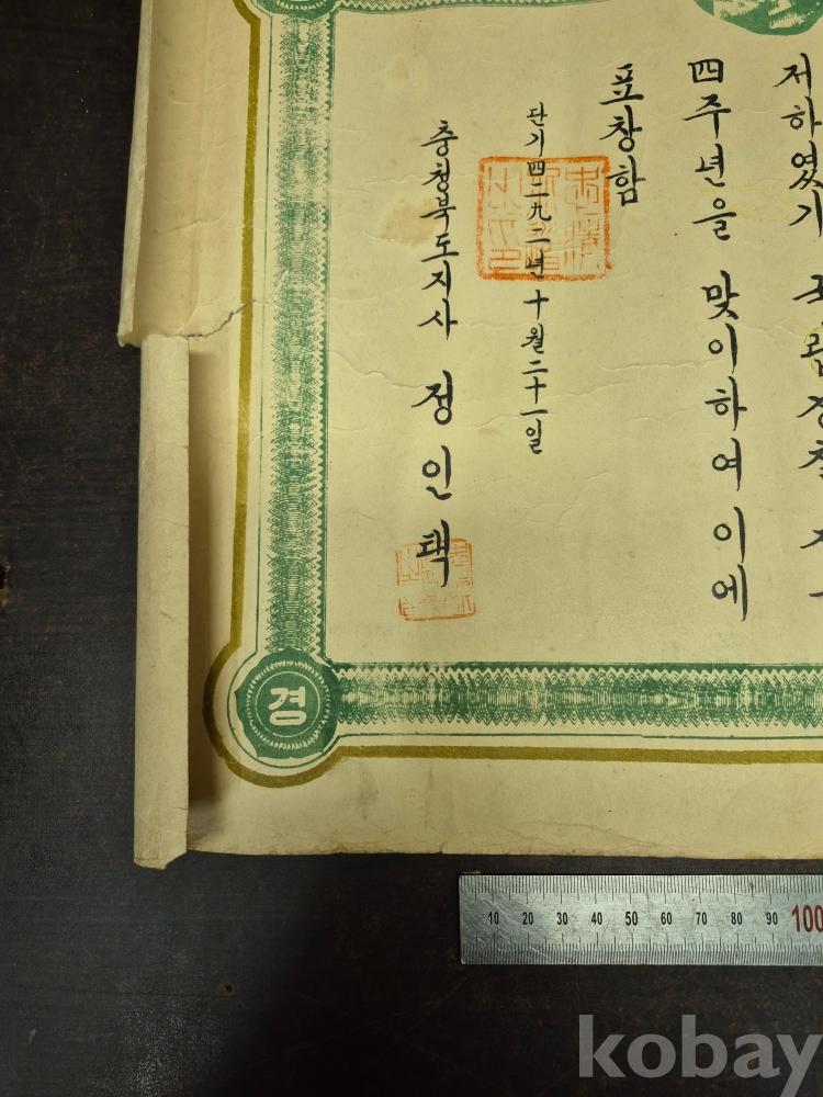 1959년 충북 옥천 경찰서 10년 근속 표창장 충청북도지사 정인택 님 53*37